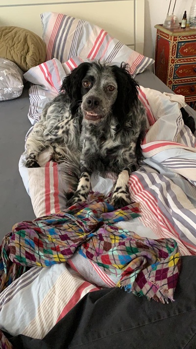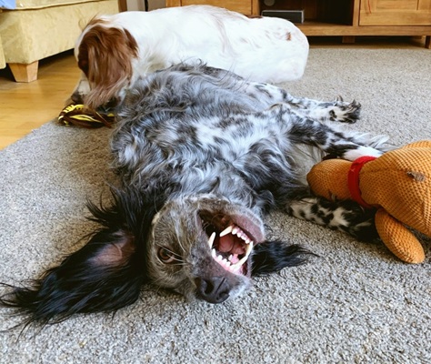 Einmal hat sie Arno abends angeknurrt, weil er zu uns ins Bett wollte ... hier entscheiden jetzt die Frauen, wer ins Bett kommt ;-)! Jetzt hat sie erst einmal Bettverbot, sie braucht klare Regeln! Wenn sie die bekommt, nimmt sie diese auch an! Streicheleinheiten und Kuscheln findet sie am tollsten! Dann schmeißt sie sich direkt auf den Rücken! Lachen kann sie auch: sie zieht dann die Oberlippe so weit nach oben, dass sie niesen muss!