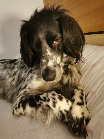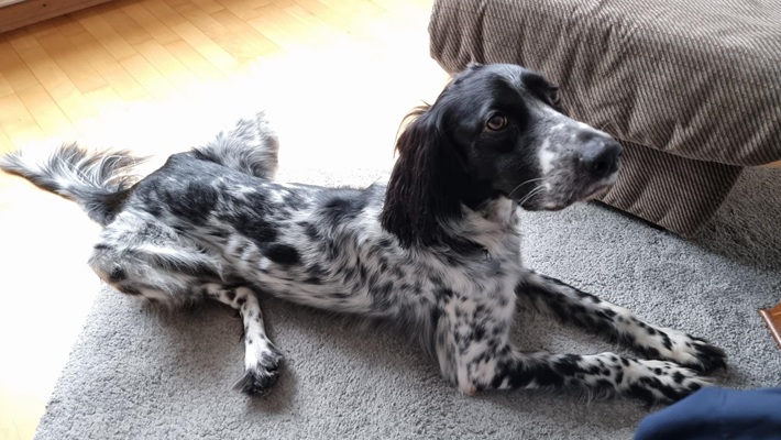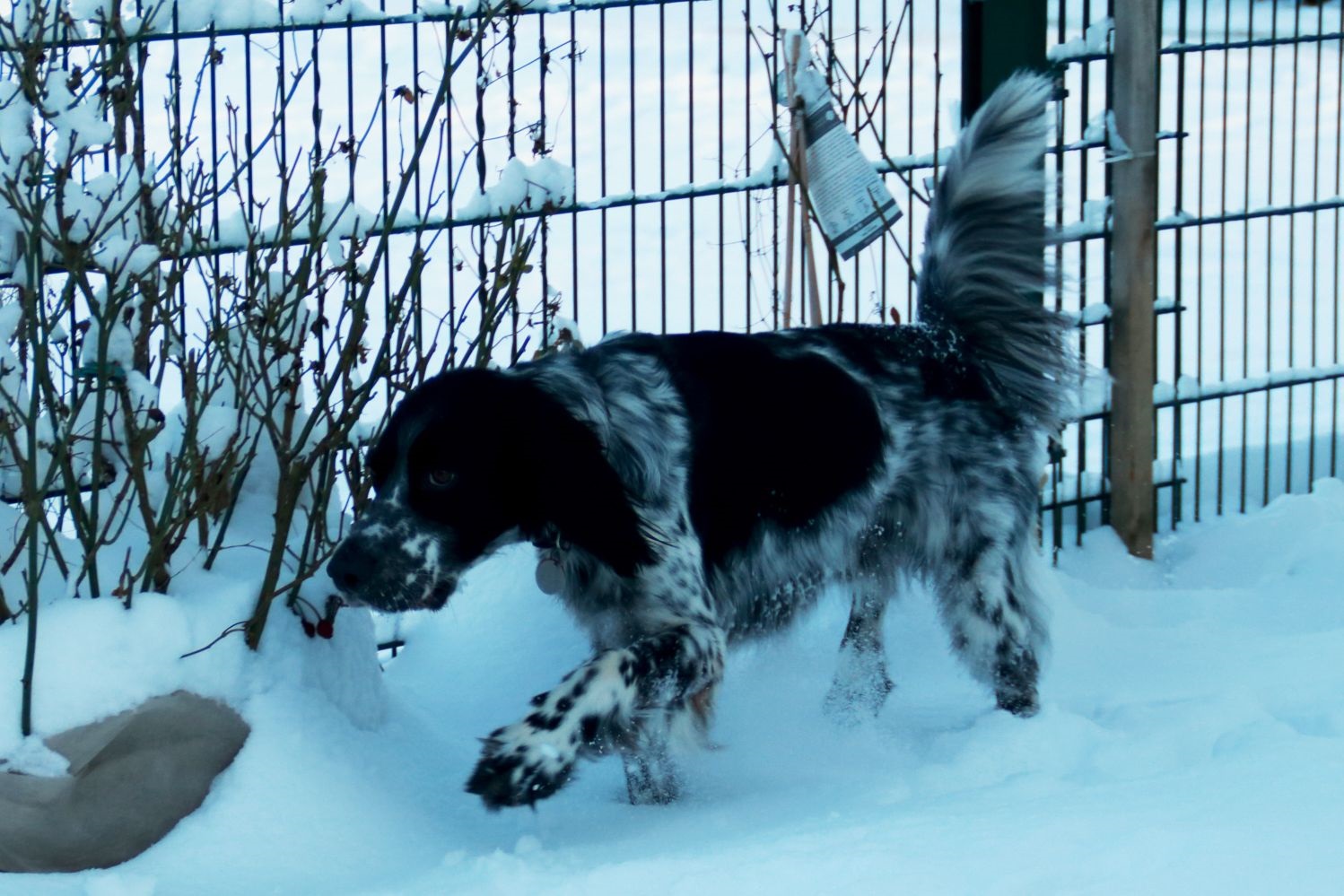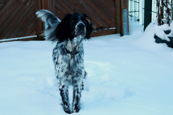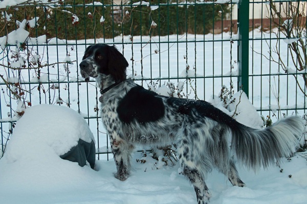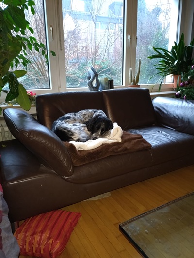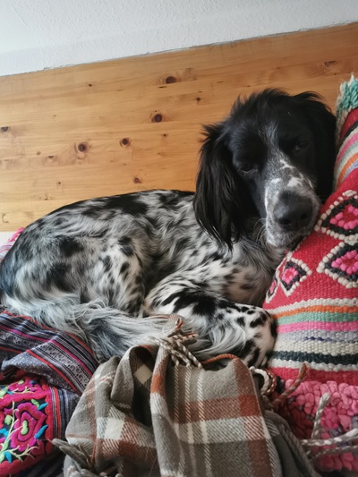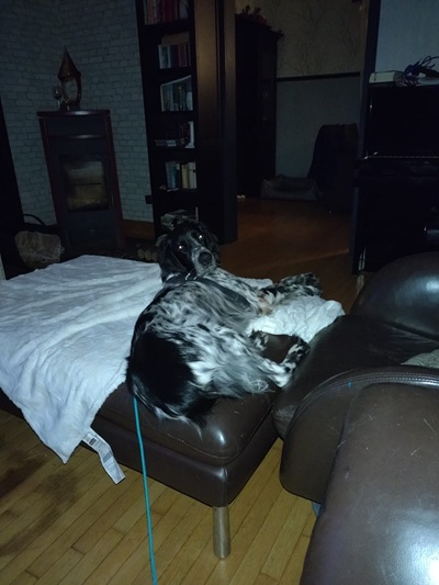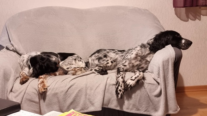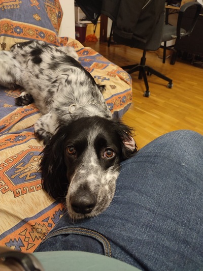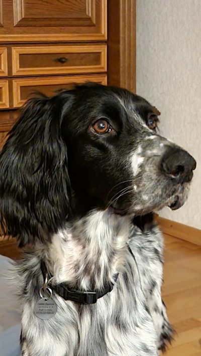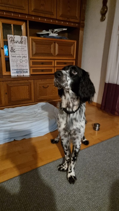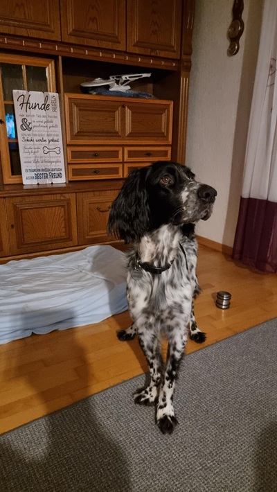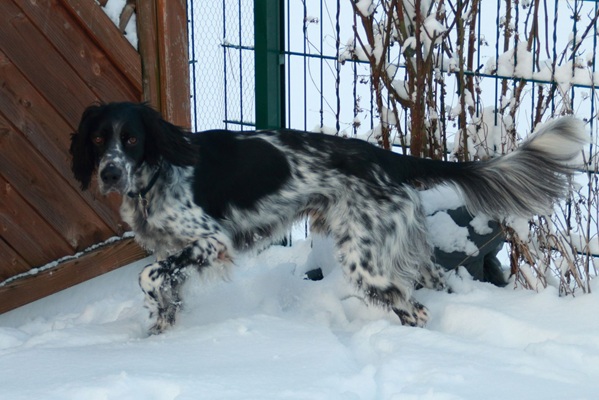 BELTZ kam gesund und munter am 16. Dezember 2023 im Setterland an. Er ist mit 59cm Widerristhöhe eine stattliche Erscheinung, sehr gepflegt, hat seidenweiches Fell und ist recht muskulös. Im Haus ist er ein Schmuser vor dem Herrn, schläft viel und bewegt sich elegant, ohne etwas zu beschädigen.