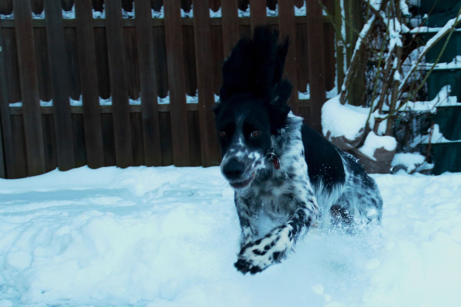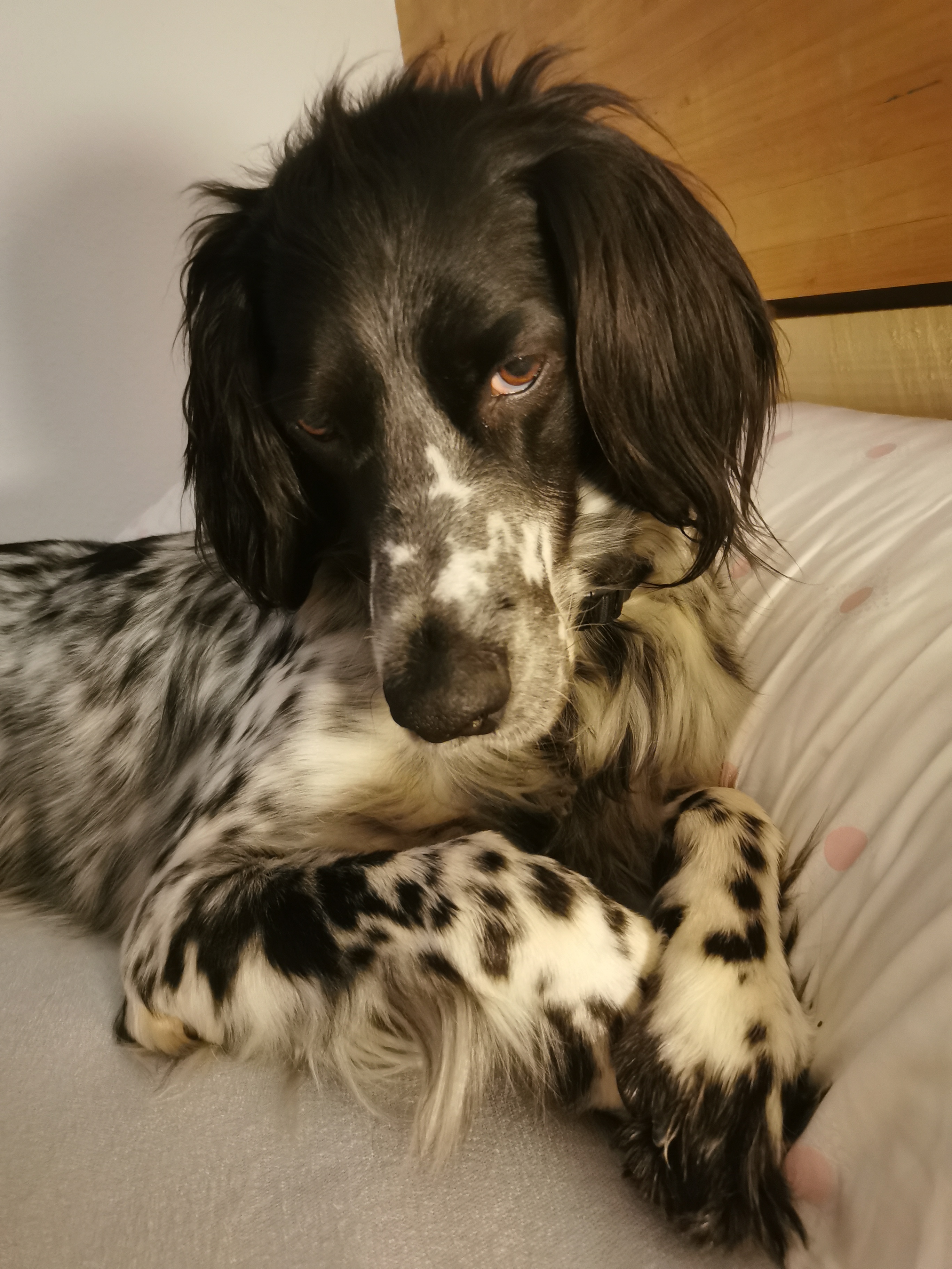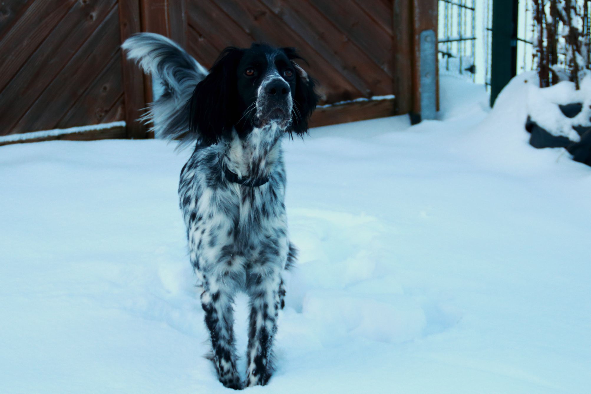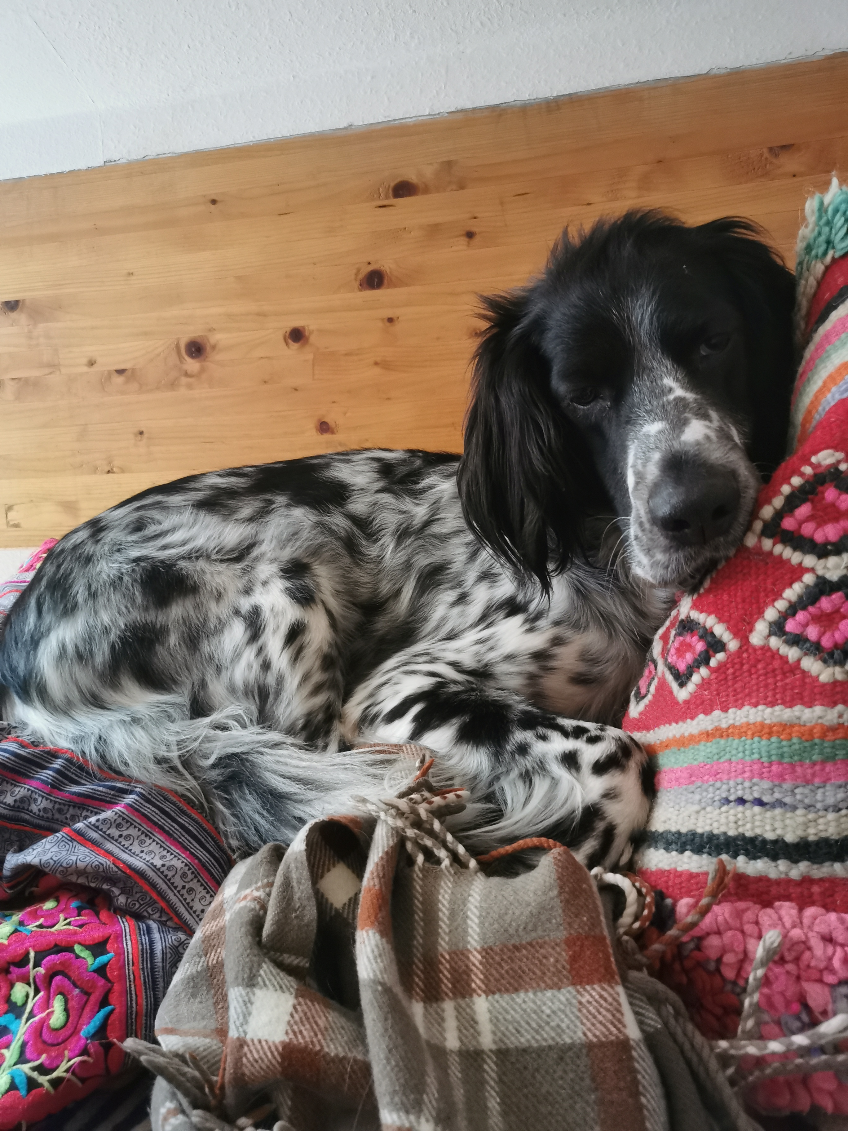 BELTZ kam gesund und munter am 16. Dezember 2023 im Setterland an. Er ist mit 59cm Widerristhöhe eine stattliche Erscheinung, sehr gepflegt, hat seidenweiches Fell und ist recht muskulös. Im Haus ist er ein Schmuser vor dem Herrn, schläft viel und bewegt sich elegant, ohne etwas zu beschädigen.
