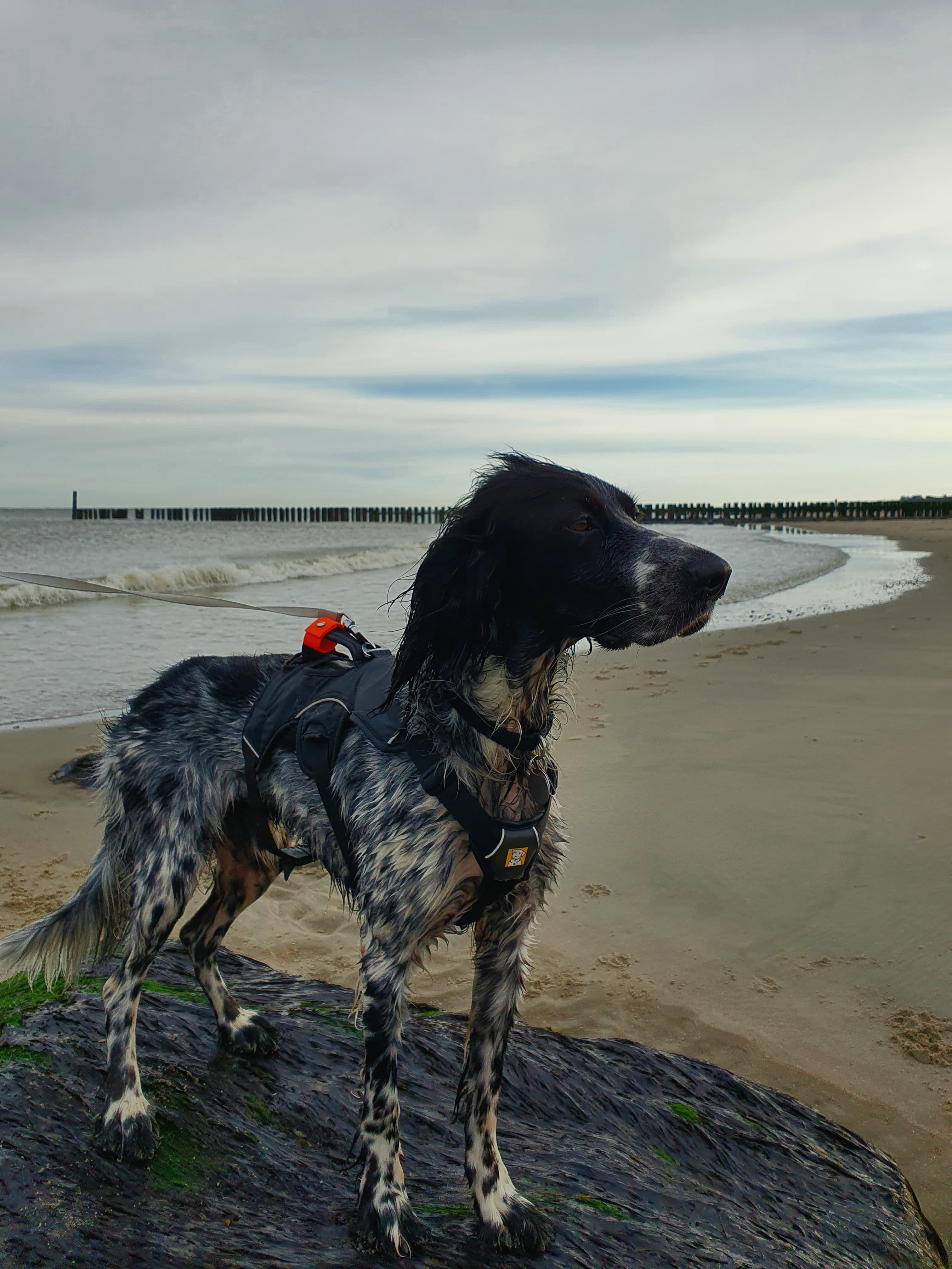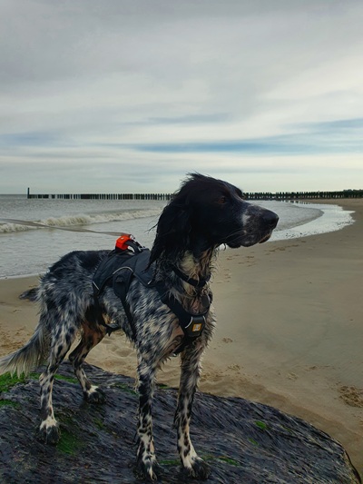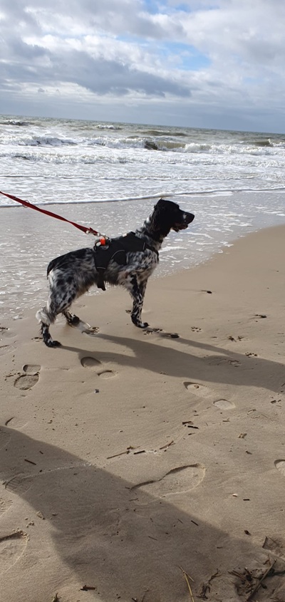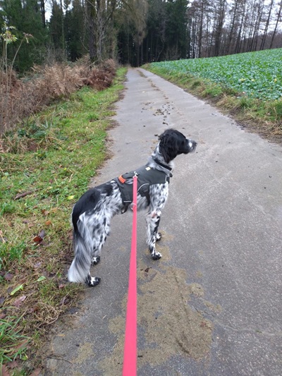 Spaziergänge verlaufen sehr dynamisch und er versucht, seinen Jagdtrieb auszuleben. Allen Katzen und Vögeln würde er am liebsten direkt nachstellen. An der Leinenführigkeit muss daher noch gearbeitet werden, bei kurzer Leine geht er allerdings schon „bei Fuß“ und der Zug läßt daraufhin merklich nach.