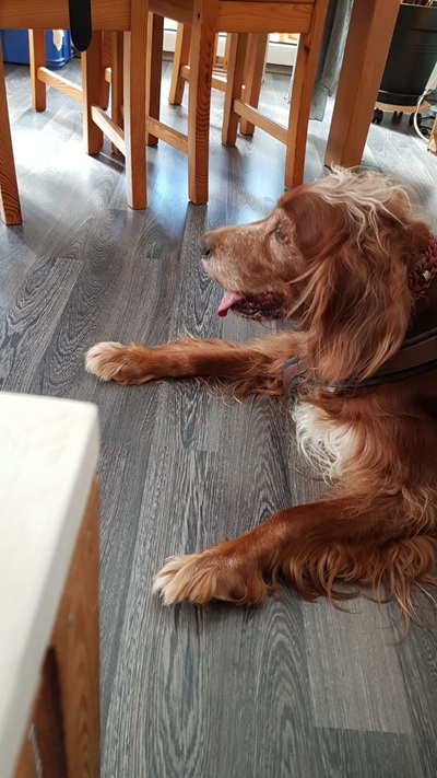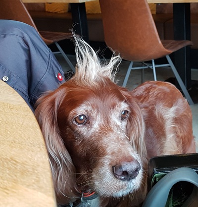 Im Cafe oder Restaurant liegt BONNY brav neben einem und wartet aufmerksam ob nicht doch mal ein Häppchen runterfällt!