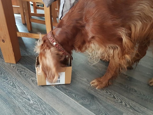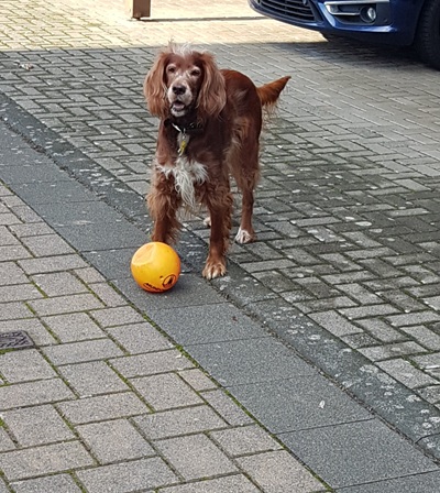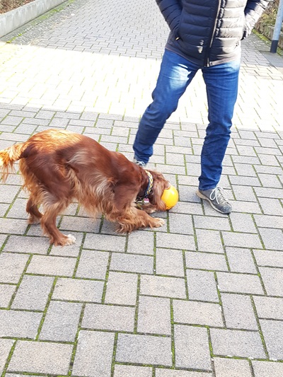 "Sie lacht einen ständig an und wenn es heißt aufstehen muss sie sich erstmal durch die Gegend Kugeln. Das macht sie auch draußen wenn man irgendwo zu lange steht. Und sie findet bei den Spaziergängen immer irgendwas zum Spielen. Haben schon zwei Stöcke und drei Tennisbälle vor der Tür liegen. Man kann auch ganz toll mit ihr ohne Spielzeug spielen also raufen da ist sie ganz vorsichtig mit den Zähnen."