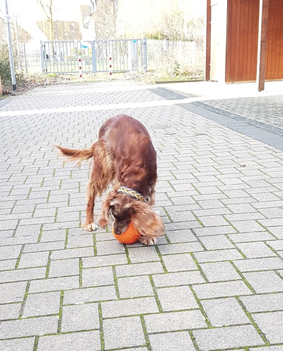 BONNY geht es prima und sie entpuppt sich als Fussballprofi. Sie spielt wunderbar und kickt den Ball sogar mit den Pfoten in unsere Richtung. Das macht Laune!
