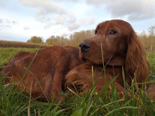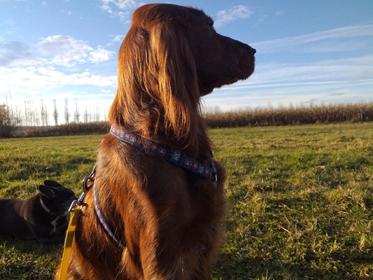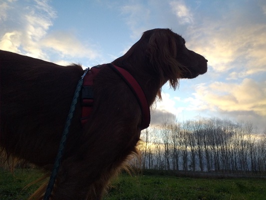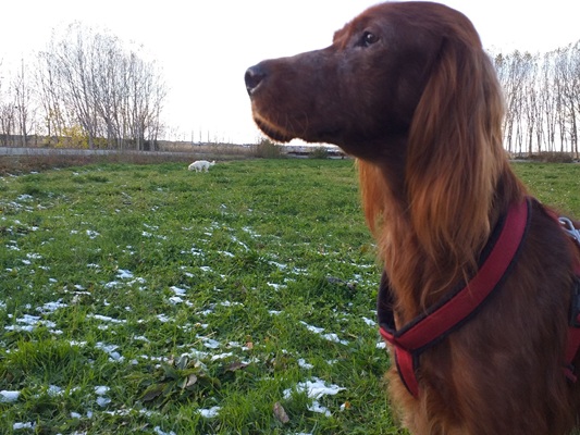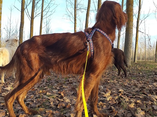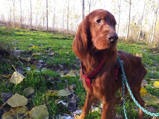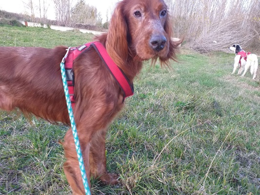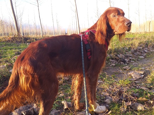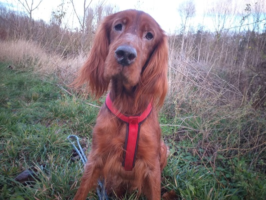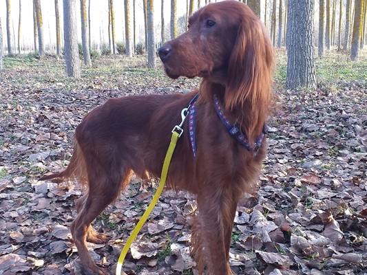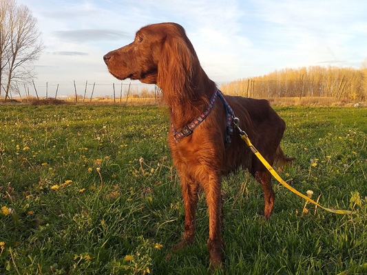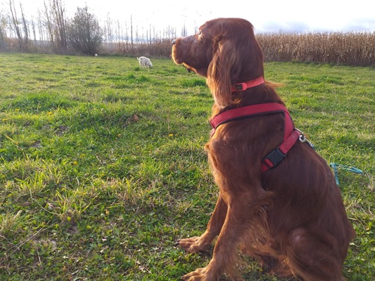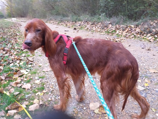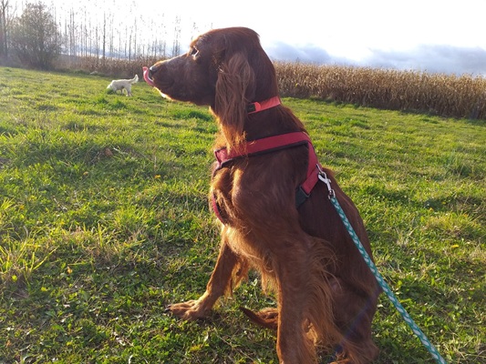 Draußen ist er Setter typisch immer mit der Nase am Boden oder im Wind, begeistert unterwegs. Er kennt nicht wirklich Kommandos, deshalb gehen wir mit ihm an der Schleppleine spazieren. Wenn die Spuren zu gut sind zieht er schon mal ordentlich. An der kurzen Leine geht Bo sehr brav.