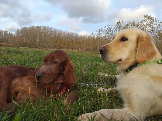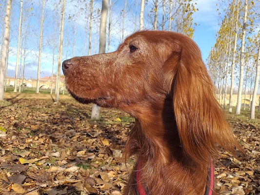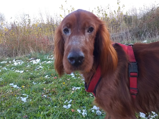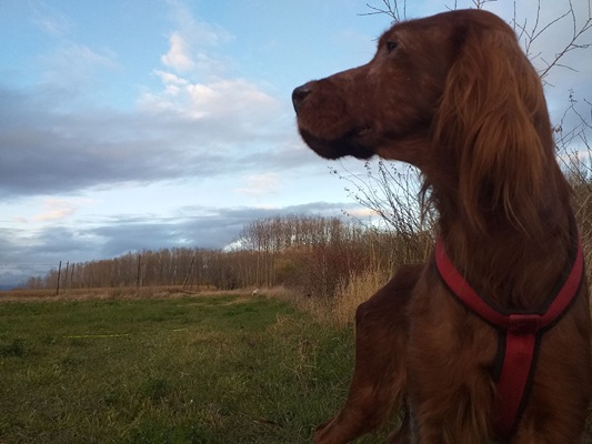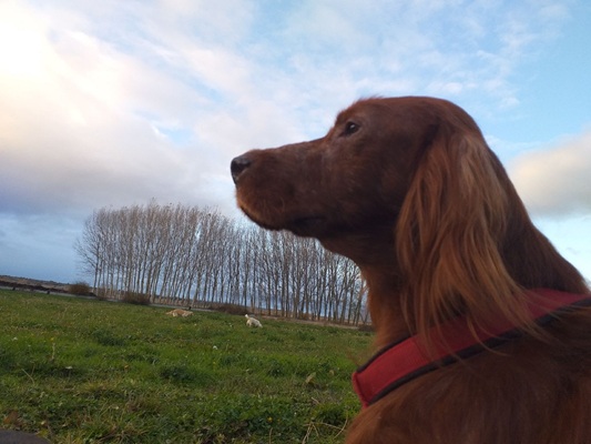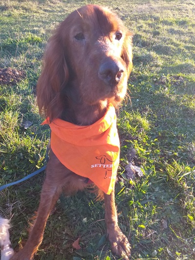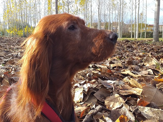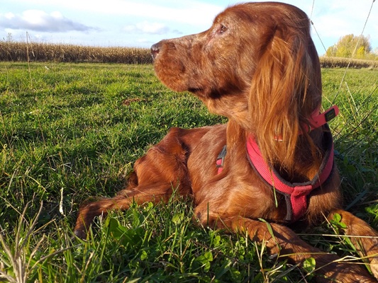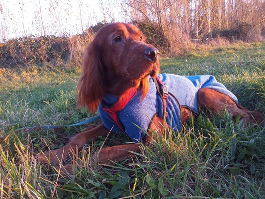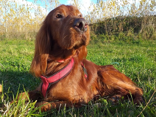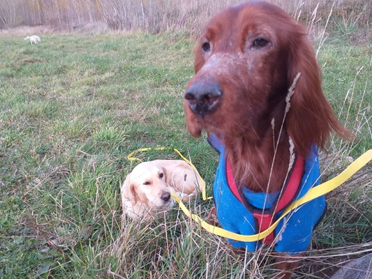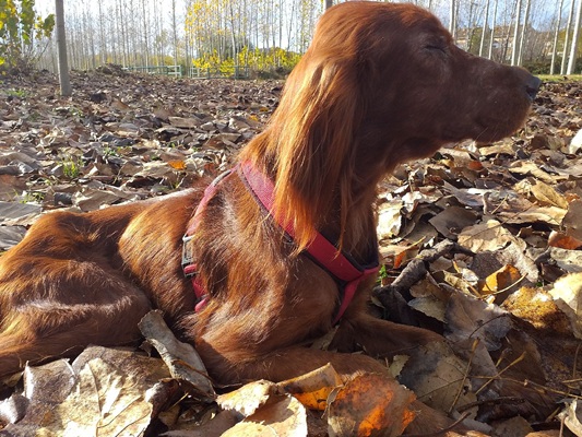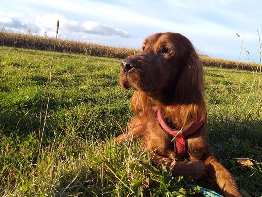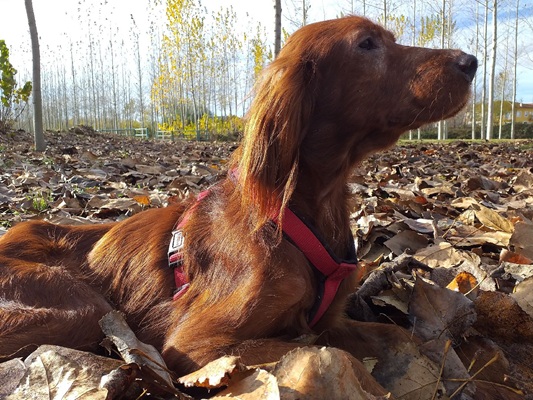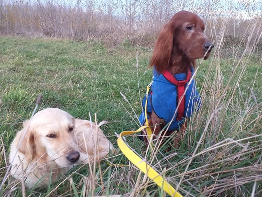 Draußen ist er Setter typisch immer mit der Nase am Boden oder im Wind, begeistert unterwegs. Er kennt nicht wirklich Kommandos, deshalb gehen wir mit ihm an der Schleppleine spazieren. Wenn die Spuren zu gut sind zieht er schon mal ordentlich. An der kurzen Leine geht Bo sehr brav.