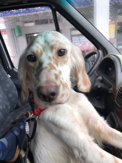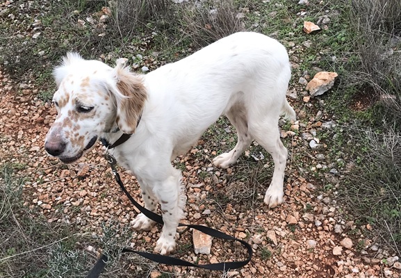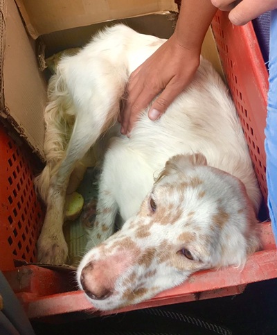 Die süße Setterine schleppte sich in ein Restaurant, ließ sich dort mehr schlecht als recht füttern und legte sich im passenden Moment neben einen deutschen Camper. Ihre Verfassung war so miserabel, dass sie von den Reisenden kurzerhand in eine große Kiste gelegt und zum nächsten Tierarzt gefahren wurde. Dort kam sie erst einmal in Quarantäne, nachdem ein Rundum-Check, Tests auf Mittelmeer-Krankheiten und die Erstversorgung des Parasitenbefalls erfolgt waren.