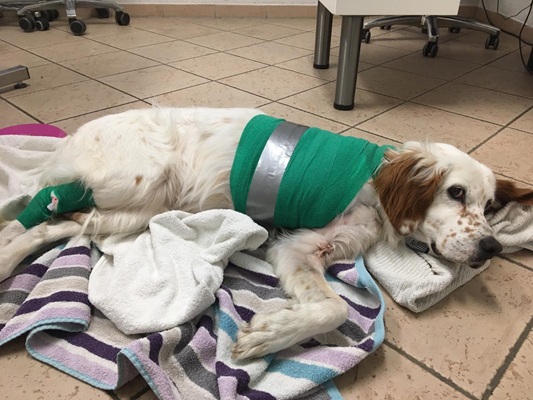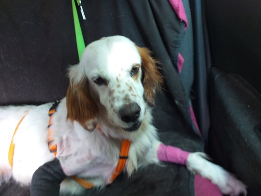 CORA sollte von ihrem Jäger eingeschläfert werden. Nach einem Autounfall hatte sie Probleme mit dem rechten Vorderlauf. Ihre Nerven dort wurden bei dem Unfall beschädigt, so dass sie das Bein nicht belasten konnte. Sie kam nicht mehr aus ihrem Zwinger heraus, weil sie Angst und Schmerzen hatte. Klare Entscheidung ihres Jägers: Einschläfern…! Unsere spanischen Tierschützer schritten ein und nahmen die todkranke Hündin zu sich. Neben ihrer kaputten Pfote hatte sie noch eine Gebärmutterentzündung, entzündete Brustwarzen und einen Vaginaltumor. Was soll man zu solchen Menschen noch sagen, die ihre Hunde so vernachlässigen?