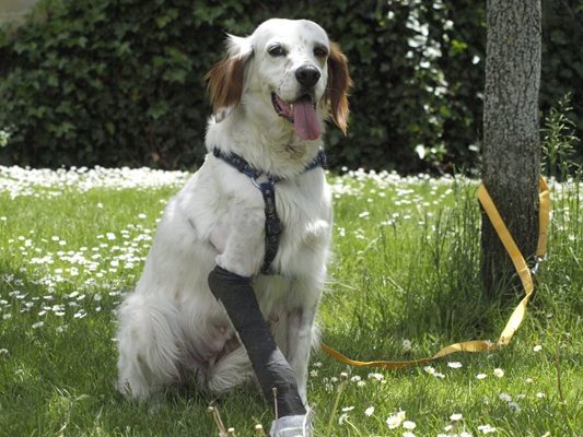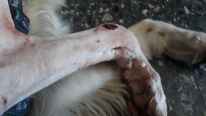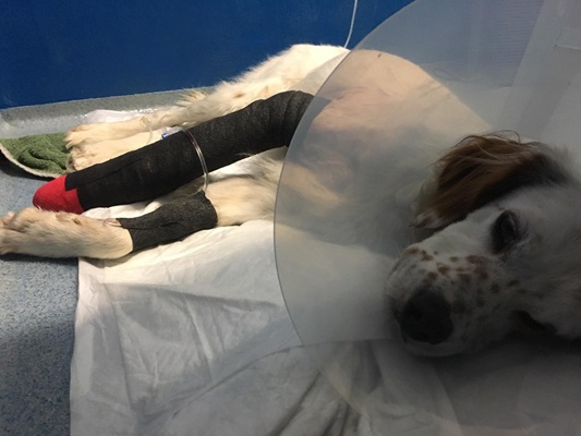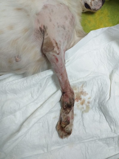 Am 15. Mai 2019 mußte sich CORA einer recht aufwendigen OP unterziehen. Ihr wurden die Bänder/Sehnen am rechten Vorderlauf zur Verbindung zur Schulter durchtrennt, weil sie nach ihrem Unfall verkürzt waren - sie wurde von einem PKW angefahren und danach hilflos zurück gelassen. Alles verheilte zwar, aber leider mit dem Ergebnis, dass sie ihren rechten Vorderlauf nicht mehr nutzen konnte.