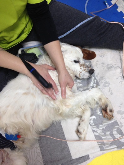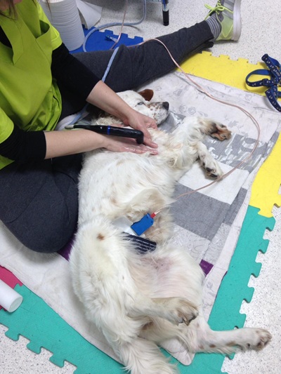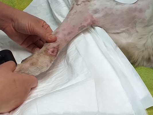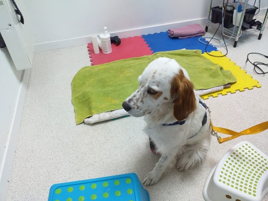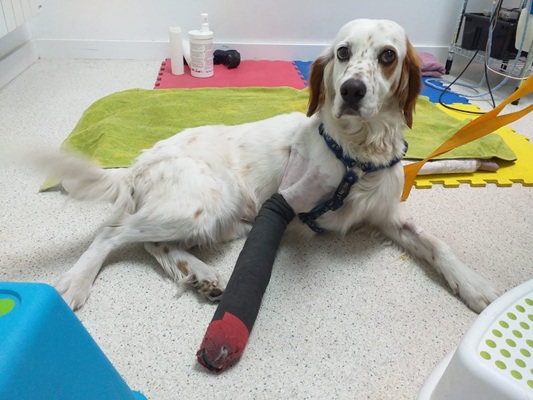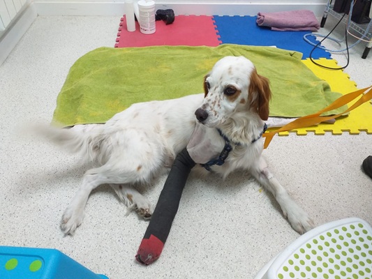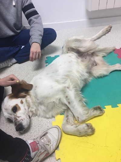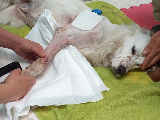 Sie hat eine Nervenverletzung und bekommt jetzt Physiotherapie, die sie geduldig mitmacht. Etwas Gefühl ist auf jeden Fall in der Pfote, das macht allen Hoffnung. CORA hat mit einem Podenco-Patienten gesprochen, der das Gleiche vor ein paar Monaten hatte und jetzt wieder laufen kann. Er sagte, Nerven haben eine lange Regenerationszeit und sie solle Geduld haben. Alle drücken CORA die Daumen.