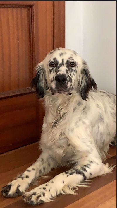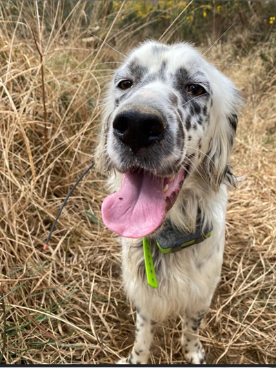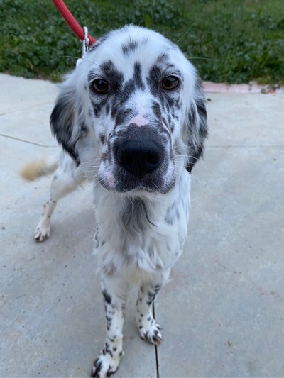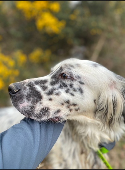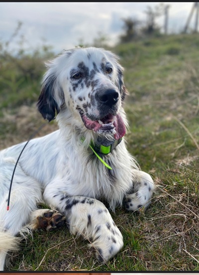 Herzerweichend schaut der kleine Blue Belton Setter mit seinen schon fast bernsteinfarbenen Augen in die Kamera. Er ist gerade einmal 1,5 Jahre alt. Seine schwarzen Tupfen der typischen Blue Belton Fellzeichnung sind munter auf seiner Schnauze und den Vorderläufen verteilt. Der Schelm sitzt ihm hinter den wach aufgestellten schwarzen Ohren und man kann sich niemanden vorstellen, der seinem Charme nicht erliegt.