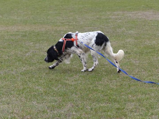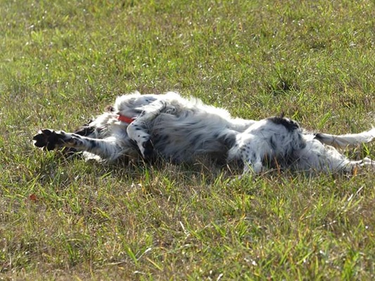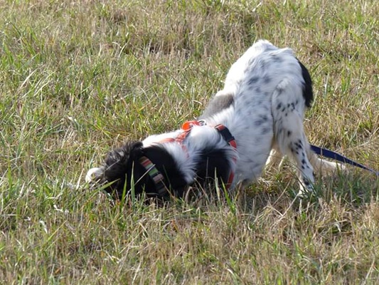 Beim Gassi gehen ist er sehr brav und geht prima an der Leine. Heute mittag waren wir das erste Mal auf einer großen Wiese, wo er an der Schleppleine laufen konnte. Er hat sich so gefreut, dass er sich mehrfach auf dem Rasen geschubbert hat. Dann hat er einen ersten Spielkammeraden kenngengelernt, mit dem er gleich mal Gas gegeben hat.