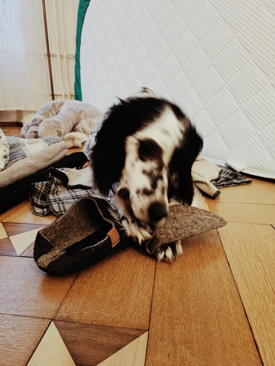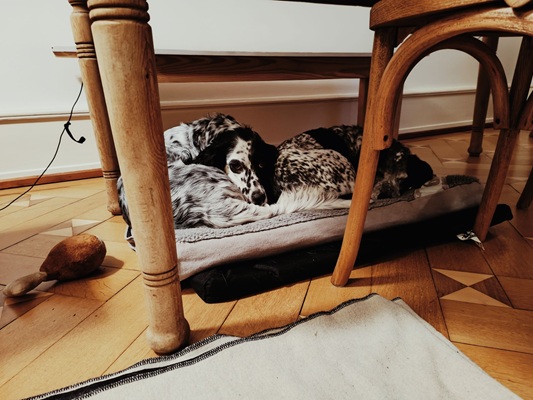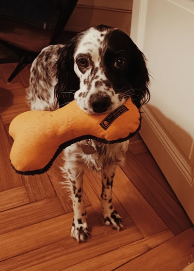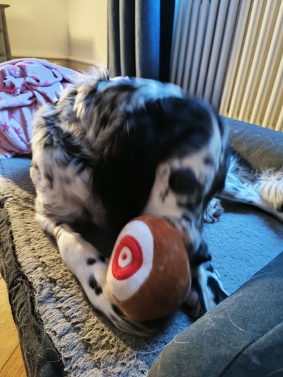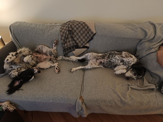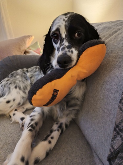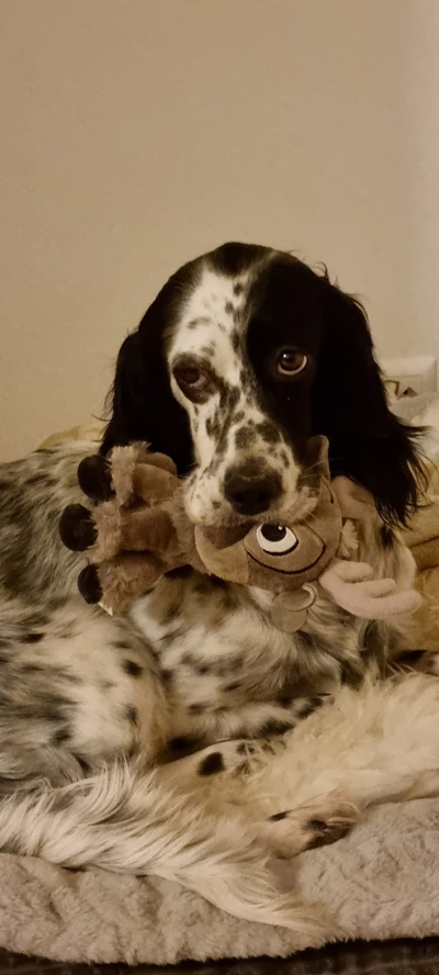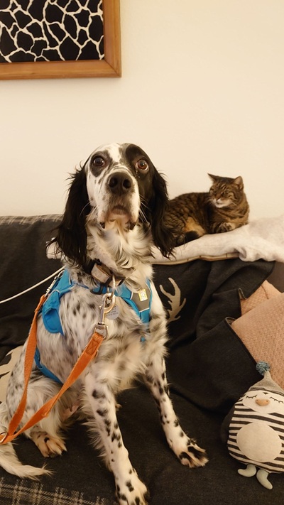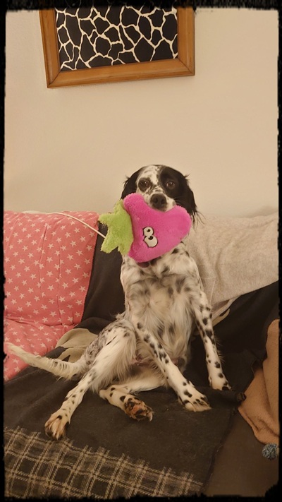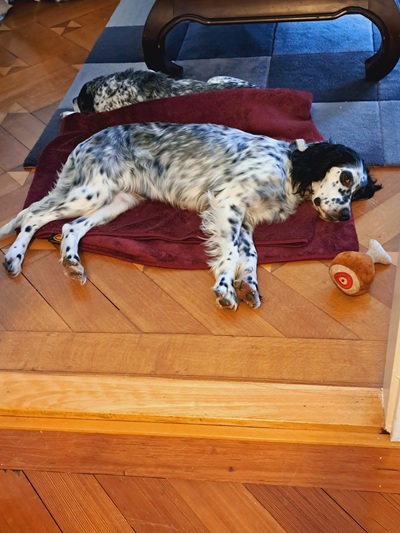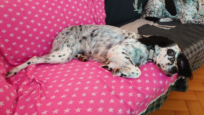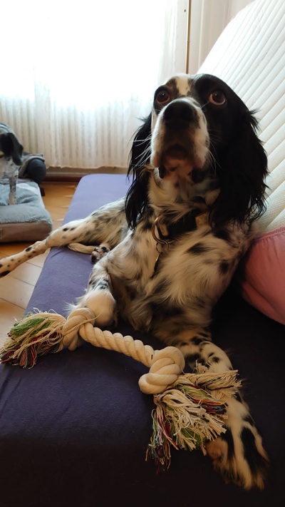 Zu Beginn war die Hauskatze natürlich auch interessant aber bereits nach ein paar Tagen als angenehme Mitbewohnerin erkannt und akzeptiert. ELARA ist ein ganz liebes Settermädchen, spielt gerne mit Stofftierchen, liebt es gestreichelt zu werden und auf dem Sofa zu liegen.