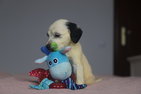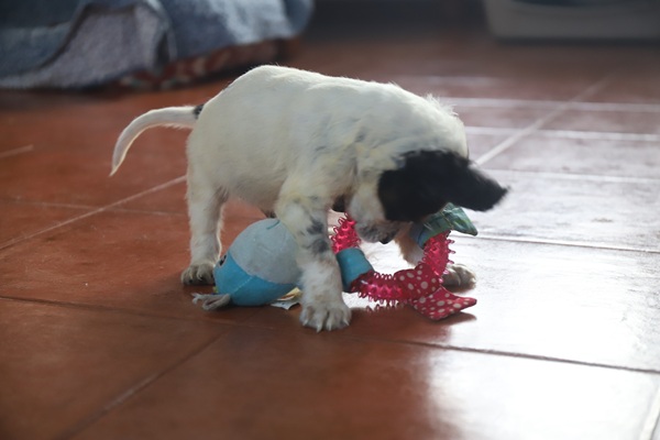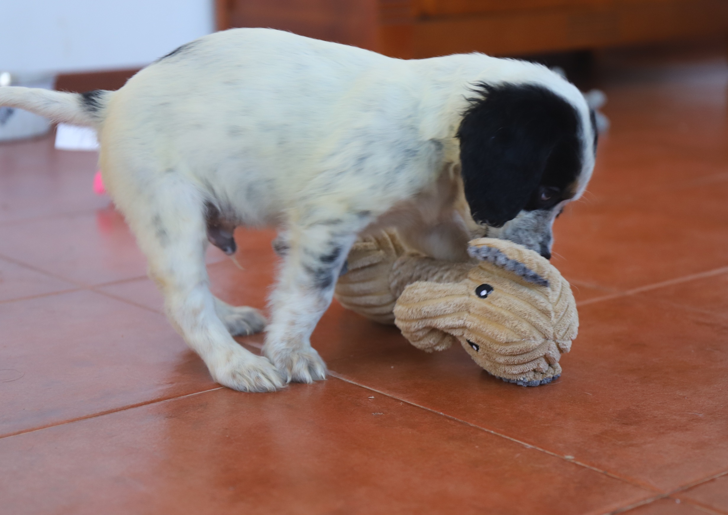 Nach der ersten Nacht in seinem neuen zu Hause, hat er seine neue Familie mit seinen Geschwistern verwechselt. Er hat mit uns den Welpen- Alltag fortsetzen wollen, so wie er es gewohnt war. Er sprang über Tisch und Stühle und über uns hinweg. Genauso wie er ruhig und entspannt sein kann, zeigt er sein überaus temperamentvolles und wildes Wesen.