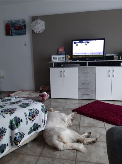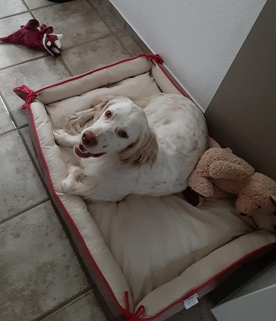 Du wirst es nicht glauben, aber das Setterland ist ein Traum. Sowas hast du noch nie erlebt: total viele nette Menschen haben uns abgeholt, als wir mit dem Transporter ankamen. Sie knuddelten uns und brachten uns zu unseren Familien. In meinem neuen Zuhause - du fällst vom Glauben ab - habe ich zwei riesengroße, weiche Körbchen. Eins im Wohnzimmer und eins im Schlafzimmer meiner Familie. Stell dir mal vor, was die alles für mich aufgefahren haben.