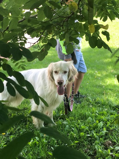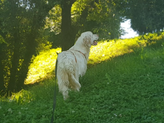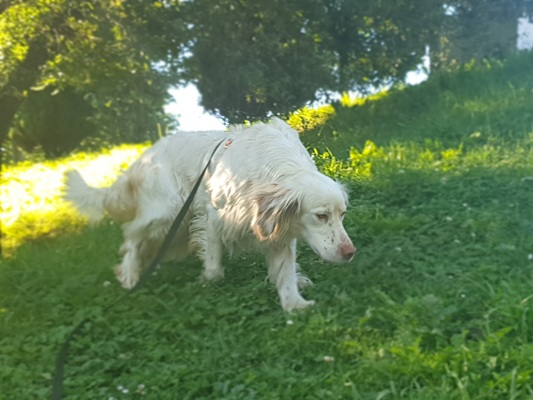 Dazu gehen meine Menschen jeden Tag mit mir spazieren. Hier gibt es einfach alles: Wälder, Seen und riesige Felder, über die man rennen kann. Und das riecht hier … göttlich, sag‘ ich dir. Es gibt allerhand Vögel und anderes Federvieh, die auf den Bäumen sitzen und ständig rufen: „Fang mich doch!“ oder „Kriegst mich eh‘ nicht!“ Ich habe tatsächlich noch keinen erwischt, aber das ist Setterkino vom Feinsten.