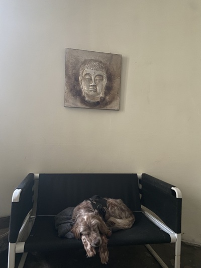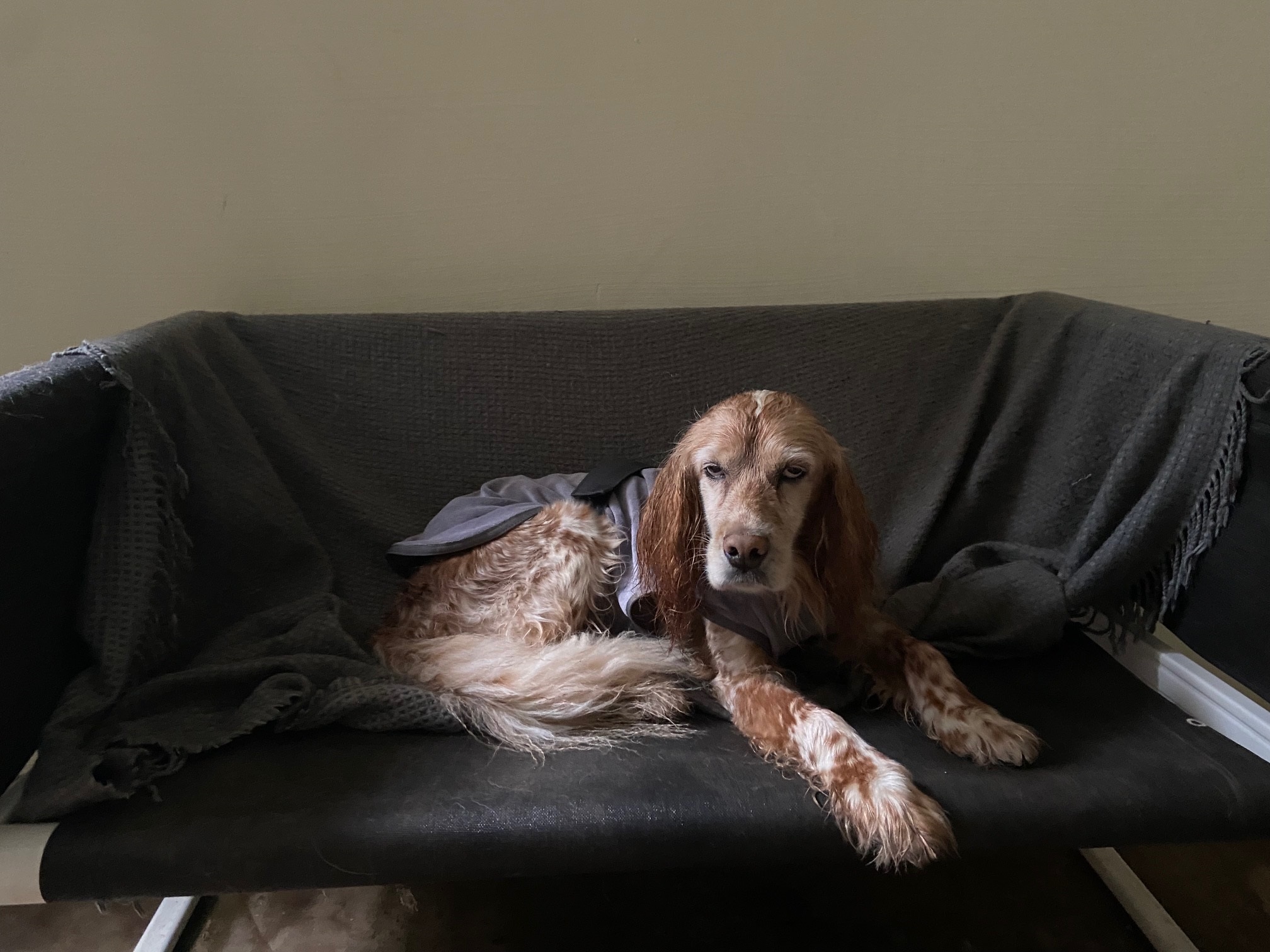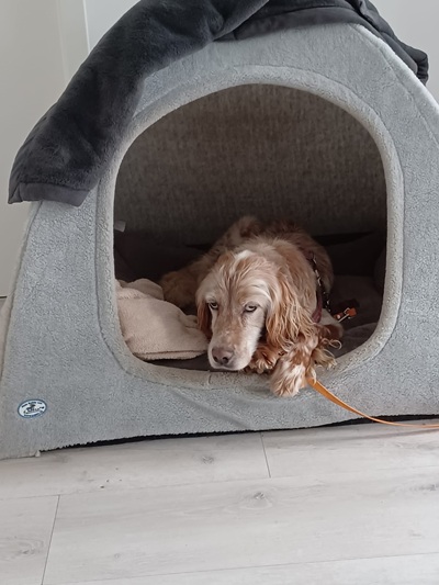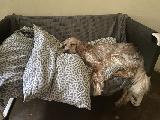 Zuhause habe ich mir die bequeme Box und die Couch erobert und verbringe sehr gerne Zeit beim Schlafen.