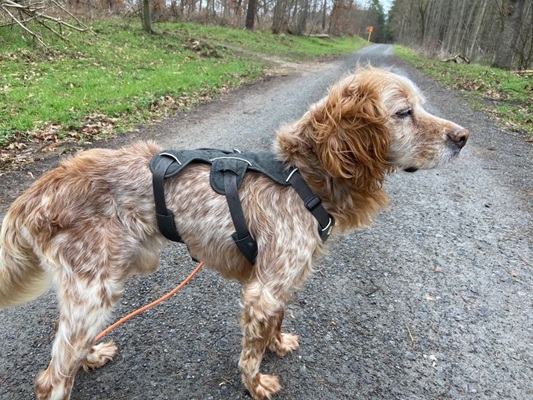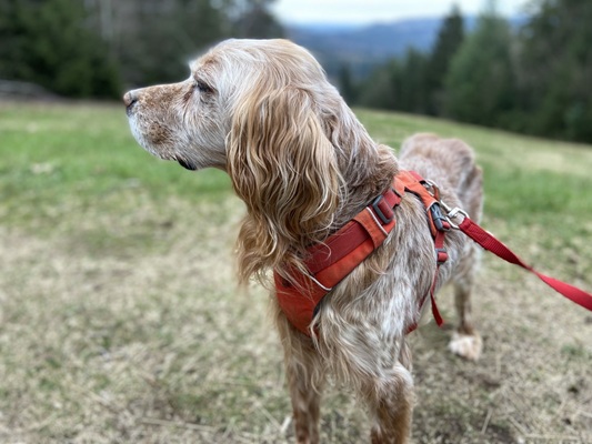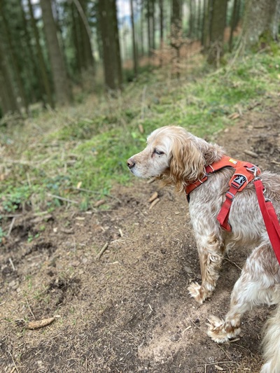 Ich mache viele Fortschritte und bin immer mit meinem Pflegefrauchen und dem Rudel unterwegs. Am Wochenende waren wir im Odenwald wandern und haben viele Rehe gesehen. Man kann mich gut mitnehmen denn ich fahre gerne Auto und benehme mich beim Wandern vorbildlich auch wenn viele Menschen und Hunde um mich herum sind. Ich habe wieder Vertrauen zum Menschen gefasst und lasse mich in Ruhe streicheln. Man muss noch vorsichtig sein weil ich oft angespannt bin ob man mich wieder schlägt. Darum mag ich die Bürste immer noch nicht so gerne. Dafür mag ich Leckerchen um so mehr davon kann ich gar nicht genug bekommen.