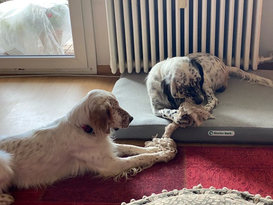 Das Verhältnis zu Blue ist noch etwas angespannt. Red ist sich noch nicht sicher, ob er den rund 1 Jahr älteren Rüden als zwischen ihm und mir positionierte Autorität anerkennen soll, was ab und zu für Reibereien sorgt. Sowohl Red als auch Blue sind aber herzensgute junge Kerle, weshalb ich sicher bin, dass wir drei uns in absehbarer Zeit zu einem harmonischen Minirudel entwickelte werden haben.