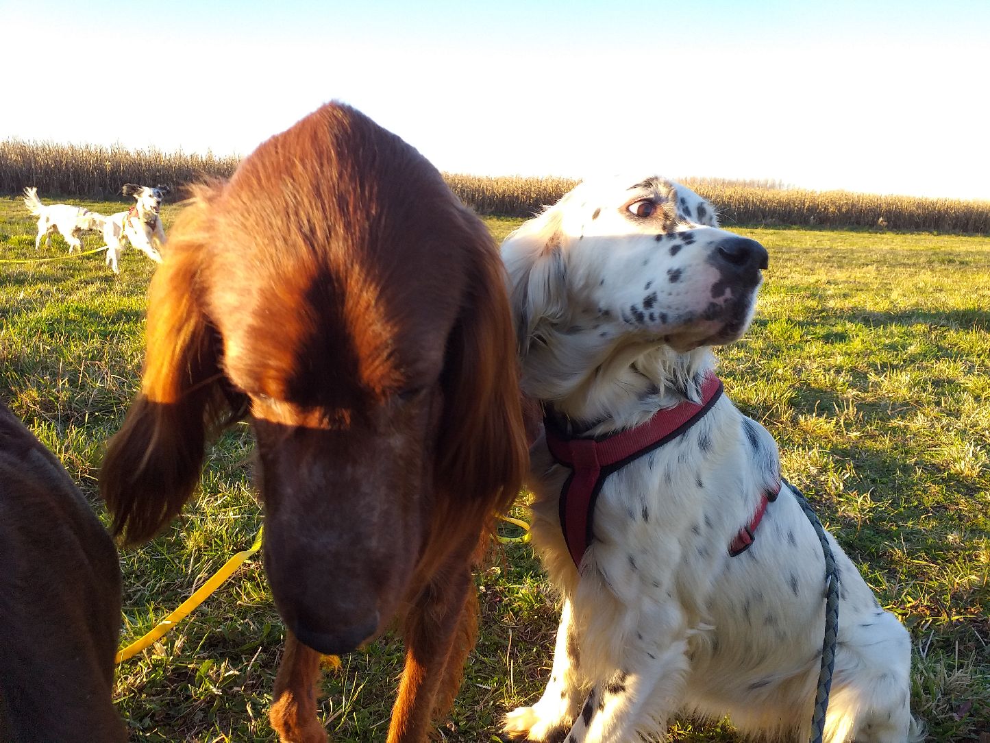 Gestern hatten wir Besuch von einem Freund mit zwei kleineren Hunden. Das klappte im Haus und auf dem gemeinsamen Spaziergang sehr gut mit den Dreien. Sina war freundlich und zeigte nur sanfte Eifersucht beim Fremdstreicheln. Die Hunde durften auch aus ihrem Trinknapf trinken (der Fressnapf war weggeräumt. Seit Sonntag lassen wir sie in gefahrlosen Bereichen frei laufen. Es klappte mit dem Rückruf schon prima an der Schleppleine an den Tagen zuvor. Sie lief dann zuerst in Mühlheim frei, auch hier reagierte sie hervorragend auf den Rückruf, danach machten wir einen Spaziergang ausserhalb und alles lief sehr gut. Seitdem machen wir Ausflüge in die nähere Umgebung, wo sie setterlike "Gas geben kann" was sie dann auch mit Begeisterung tut. Sina ist es sehr wichtig, zu gefallen und alles richtig zu machen. Sie kennt ihre Regeln und Freiheiten und genießt es so. Vergisst mal jemand ihr die Pfötchen, nach dem Reinkommen ins Haus abzuwischen , guckt sie verwundert und vorwurfsvoll und fordert es sanft ein. Sie ist unser Sina- Sonnenschein und unsere bezaubernde Sinie, wir haben für uns die perfekte Hündin und wir gefallen ihr wohl auch recht gut.