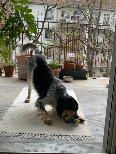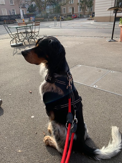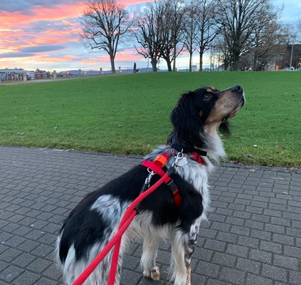 Die doofe Jahres-Unke Corona verhinderte die Reise nicht, vermieste uns aber, den Räuber HOTZenplotz, wie wir ihn alle erst einmal nannten, direkt aus dem Bus in die Arme zu schliessen. Aber da stand an unserer Stelle Gerold, angereist aus Nimburg und nahm ihn in Empfang und brachte ihn sicher zu sich nachhause, wo Fabienne, wieder coronabedingt ohne mich auf ihn wartete. Auch dafür ein riesengrosses Danke, so eine grossartige Organisation von SRG/SRS und liebevolle Begleitung. Und dann war er endlich da, wir haben uns im Auto von Fabienne zum ersten Mal gesehen. Und Luiz legte sofort seinen Kopf auf meine Schulter. Herzräuberling, süsser. Und inzwischen kommt er langsam an (naja, langsam ist eigentlich ein Fremdwort für ihn…) Frech, lustig, überhaupt nicht scheu, unglaublich neugierig und immer auf der Suche nach Futter. Eigensinnig, setterlike dickköpfig, charmant. Da er erst kurz vor der Reise kastriert wurde und die Fäden noch nicht entfernt waren mussten wir gleich am ersten Werktag nach seiner abendlichen Ankunft zur Tierärztin. Luiz fand das aufregend und spannend und die Leckerli ausgezeichnet, mehr bitte,...…das Fädenziehen mit Bestechung war kein Problem und die Entzündungen heilten in den nächsten beiden Tagen gut ab. Die uncoole Plastikhalskrause liegt unbenützt da, es ging gottseidank ohne. Luiz ist insgesamt pumperlg’sund, wie man bei mir zuhause in München sagt, aber mit mageren 17,4 Kilo bei 60 cm Schulterhöhe ist an dem Kerlchen kaum was dran. Essen ist alles und Luiz liebt neben seinem Futter besonders Karotten, die er im Handumdrehen schreddert. Drinnen völlig unkompliziert und entspannt , draussen hat er Energie wie ein Wirbelwind. Der Park vor der Haustüre, direkt am Rhein, ist eine riesige Herausforderung , soooooo viele Möwen, Raben und Gänse…und abends all die Lichter. Die ersten Abende stand Luis am Ufer, völlig verwirrt, warum das Meer plötzlich fliesst und auf der anderen Seite eine anderer Kontinent ( naja, eine anderer Stadtteil von Basel) ist…mit noch mehr Möwen. Hunde sind zum Spielen willkommen, Katzen noch keine aufgetaucht….aber wenn wir mal nach Aachen zu Julian, den Luiz nun auch schon kennst, fahren wollen, dann müssen wir noch „Katzen Mögen" üben…..Die Ausflüge in den Park und in die Nachbarschaft sind bis dahin jeden Tag aufs Neue eine Aufregung- "darf ich einfach sein oder muss ich alles jagen", scheint er sich dauernd zu fragen. Und solange das Einmaleins noch nicht sitzt ( doch : „Sitz“ geht schon prima, wenns Fressen gibt oder die Leine angezogen werden soll) ist Spazieren nur mit Doppelleine möglich und das wird wohl auch noch eine Weile so bleiben. Das schicke neue G’stältli ( schweizerdeutsch für Geschirr) aus Neoprenmaterial sieht was wie zum Kite- Fliegen und hat ihm bei den Kindern schon den Namen „Luis Lenkdrache“ eingebracht. Heute waren wir zum ersten Mal im umzäunten grossen Garten, ganz ohne Leine und Luiz hat sich mit Lupo, dem Pudel des Nachbarn um die Wurfbälle gebalgt. Wild, aber nicht grob. Nur wenn’s um Leckerli geht, dann wird’s mal heftiger und dann kann Luiz auch bellen! Im Haus ist er mäuschenstill und lammfromm, ein begnadeter Kuschler und Spieler, aber auch sehr eigenständig- er hat sich seine Rückzugsorte gesucht und kommt, wenn er mag- fast wie eine Katze. Sofa ist für die Menschen, aber die sind am Boden zum Spielen und Knutschen hoch willkommen.