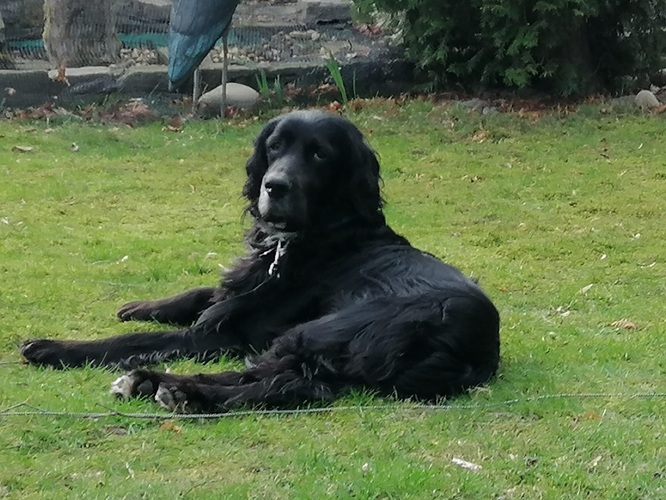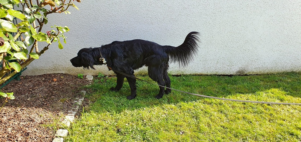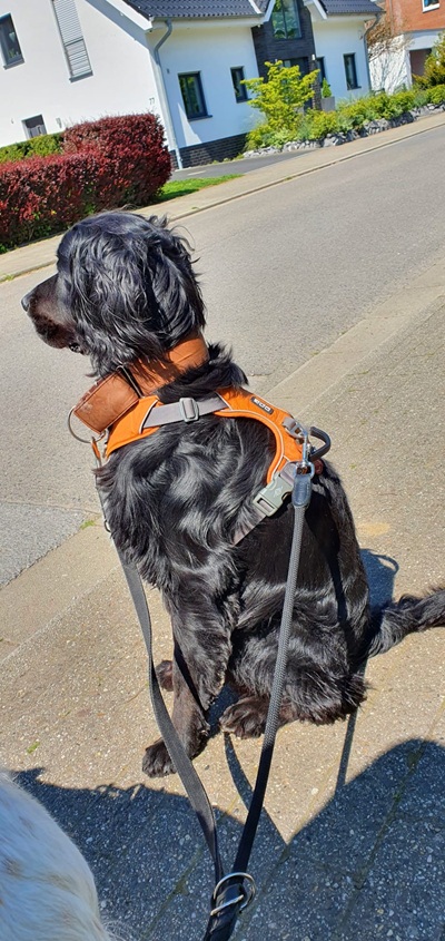 liebt die täglichen Spaziergänge sehr. Die Leinenführigkeit hat sich schon verbessert, solange nicht seine Lieblingstiere wie Eichhörnchen und Vögel (Raben, Tauben etc.) ins Spiel kommen. Jetzt erwacht der Jagdhund - warscheinlich fließt eine gehörige Portion Gordon Setter Blut in ihm.