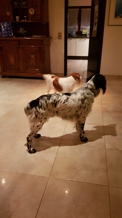 JAMES wird immer neugieriger, läuft locker vorweg, spielt gern eine Runde mit Pinto im grossen eingezäunten Gelände, da hat er richtig Spass. Drinnen bleibt es nun seit Tagen sauber, er weiß nun, dass draussen laufen auch gleich lösen ist. Er kommt zu uns auf die Couch zum Kuscheln.