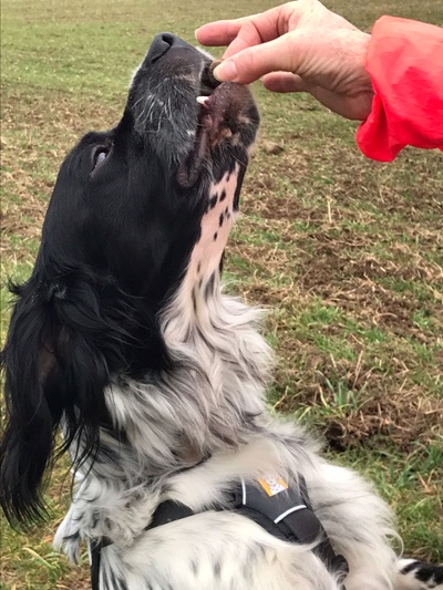 Lekkerli und Quark-Leberwurst in der Spritzdose sind heiß begehrt, dafür bringt er sogar ein Bällchen zurück. Das haben wir ganz neu am Wochenende ausprobiert. Wir üben auch ein Sitz beim Herankommen und am Straßenrand. Vor lauter Spaß wird daraus manchmal noch ein Anhüpfen.
