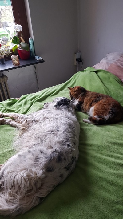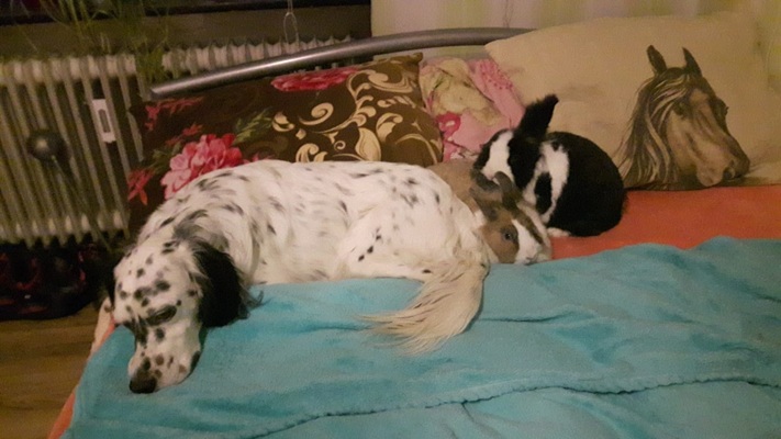 Am liebsten kuschel ich auf dem Sofa oder im Bett, bleibe aber auch auf meinem Platz wenn es sein muss. Mein großes Problem ist, dass ich nicht schussfest bin. Deswegen wurde ich damals auch von meinem Jäger abgegeben. Ich mag kein Gewitter oder wenn es knallt. Da verstecke ich mich immer.