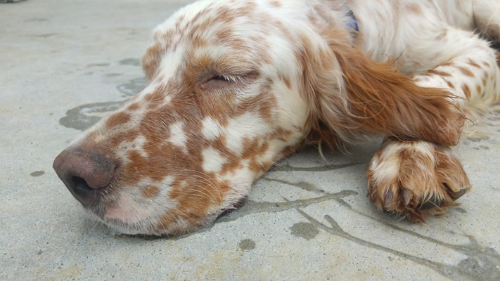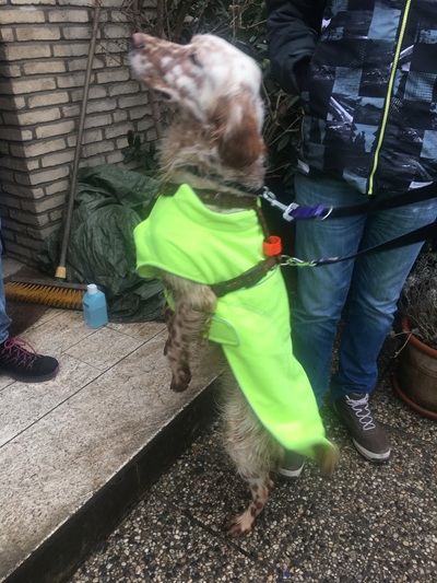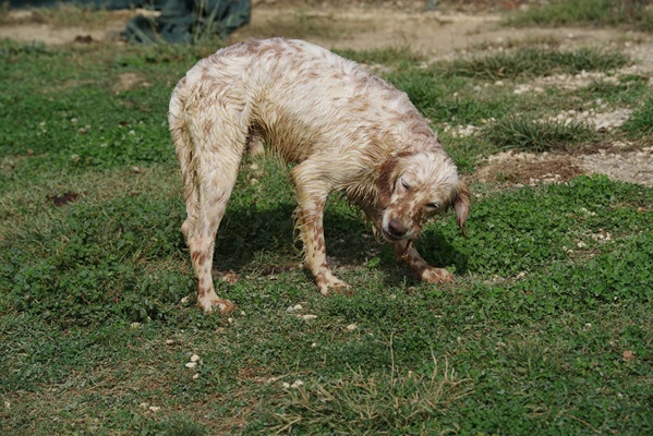 Draußen läuft er inzwischen ganz gut an der Leine. Mit anderen Hunden versteht er sich gut. Nur herumtollen geht leider nicht, da man ihn noch nicht ableinen kann. Er reagiert auf alles was Flügel hat, und auch Mauselöcher sind interessant. Wie stark sein Jagdtrieb tatsächlich ist, können wir aber nicht einschätzen. Nach dem Spaziergang ist es oft nötig die Pfoten zu waschen. Das lässt er anstandslos geschehen und genießt es, hinterher trockengerubbelt zu werden. Nur von alleine geht er noch nicht in die Dusche, da muss er hinein gehoben werden.