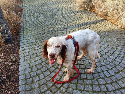 Draußen ist er eher gemütlich unterwegs und geht auch recht gut an der Leine. Es sei denn es kommt ein Eichhörnchen oder irgendetwas anderes das ihn interessiert, dann kommt Leben in den Burschen.