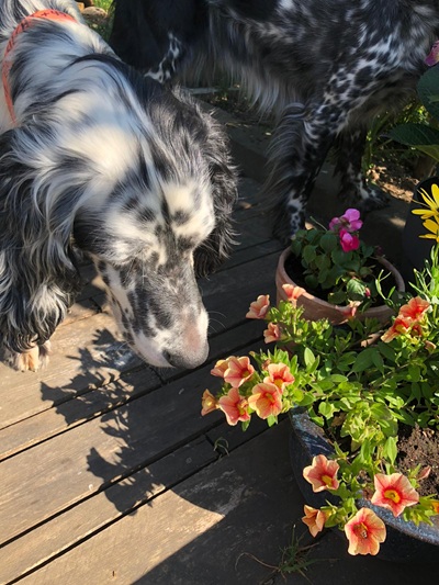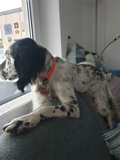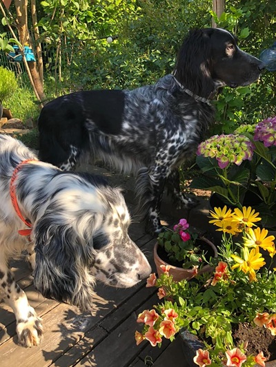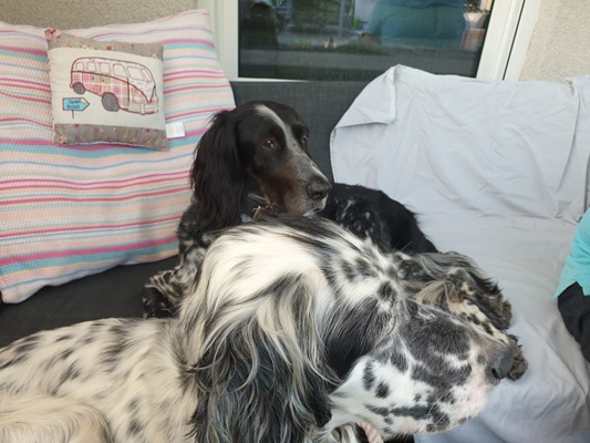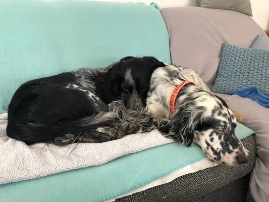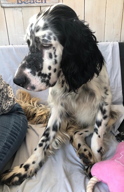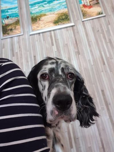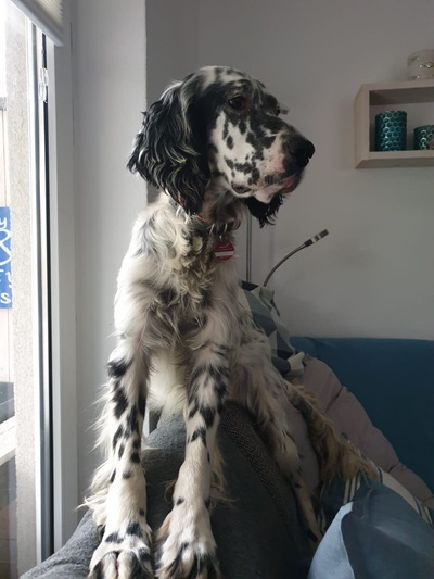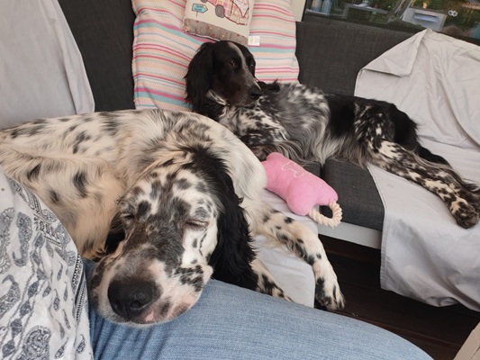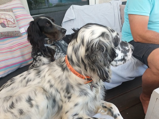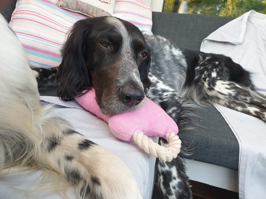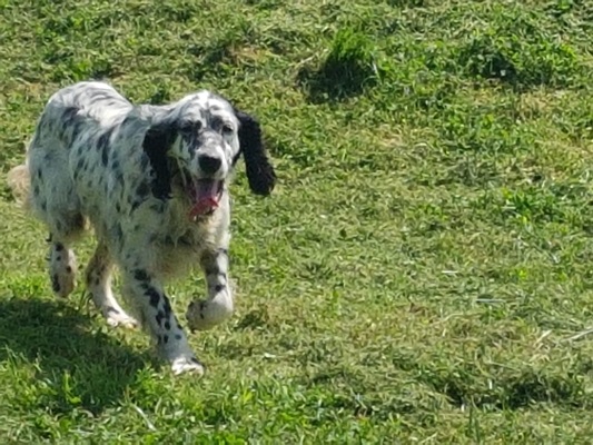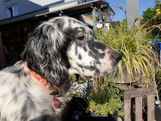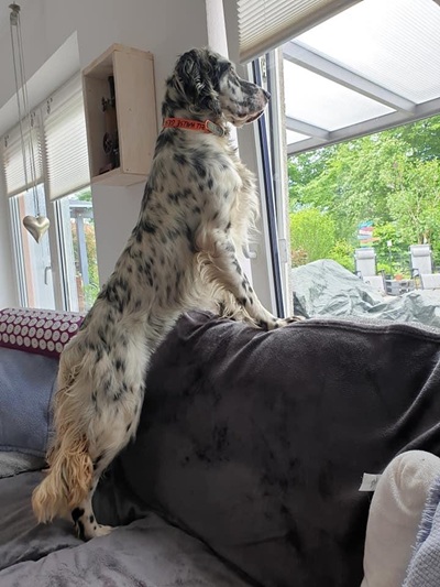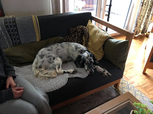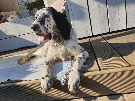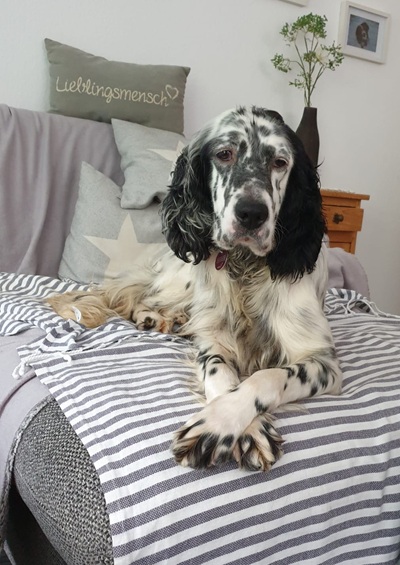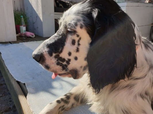 KOBA kam gesund und munter am 09. Mai 2020 im Setterland an. Sie war zunächst recht ängstlich und unsicher, doch traut sich am 2. Tag nach ihrer Ankunft sogar schon bis in die Küche. Draußen ist sie sehr vorsichtig. Menschen gegenüber ist sie sehr scheu und versucht wegzukommen. KOBA's Jagdinstinkt ist sehr ausgeprägt, sie liebt alles, was fliegt. Sie ist eine süsse und verschmuste Setterine.