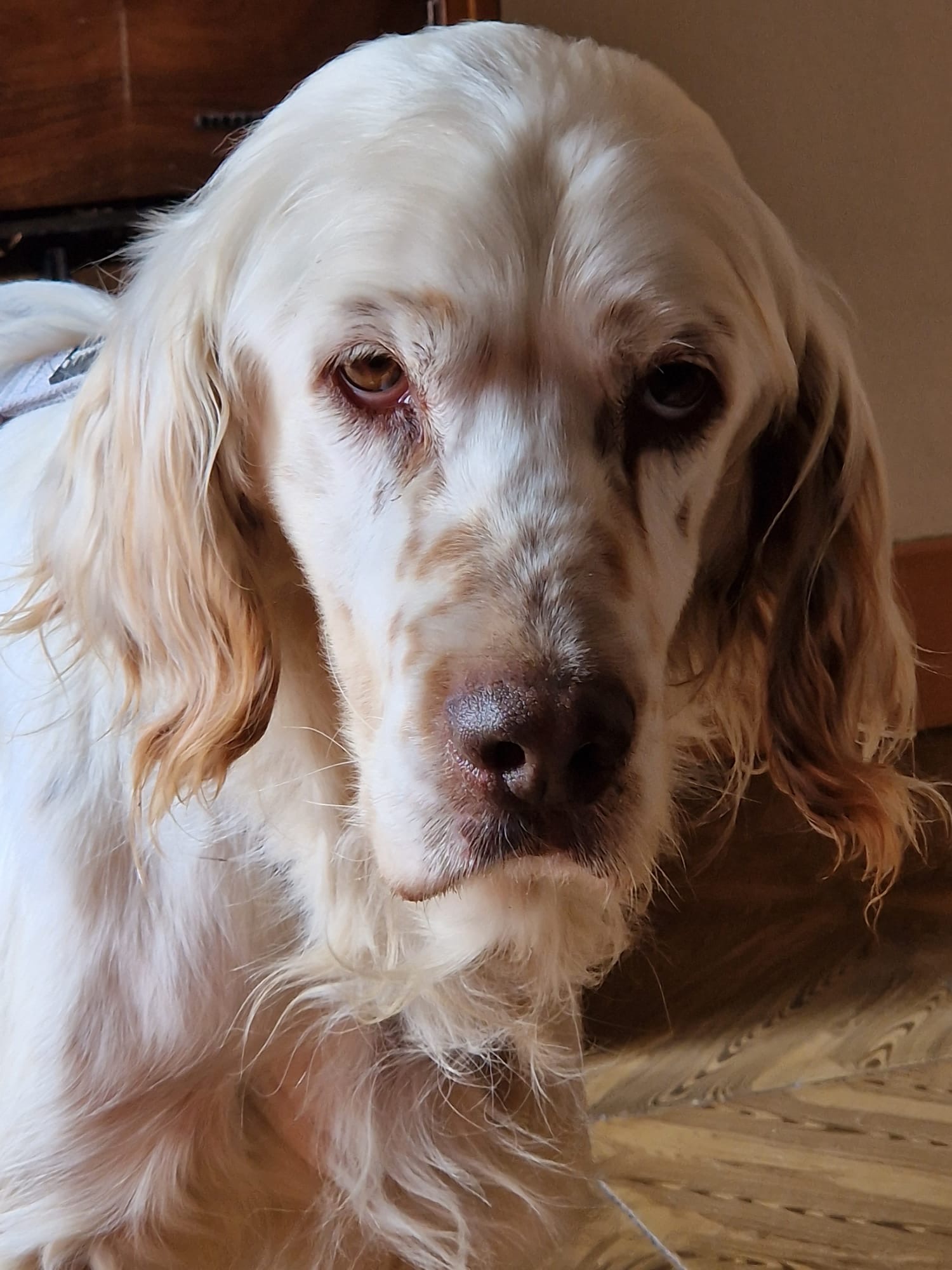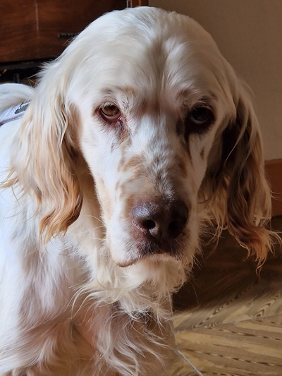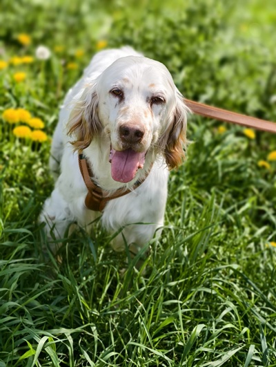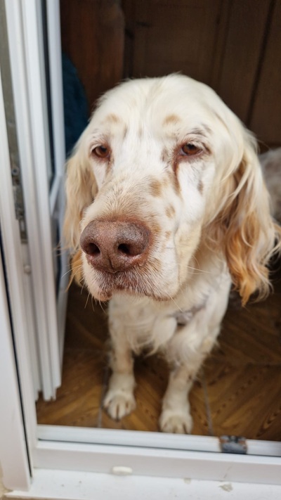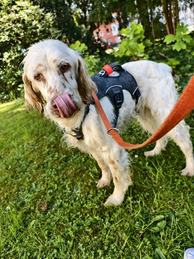 Treuherzig schaut KUN in die Kamera. Er ist ein dankbarer älterer Settermann, der bisher nicht viel Schönes erleben durfte. Als Welpe hat man ihm einfach die Rute abgeschnitten. Viele Jäger begründen dies mit einem geringerem Verletzungsrisiko beim Stöbern im Dickicht.