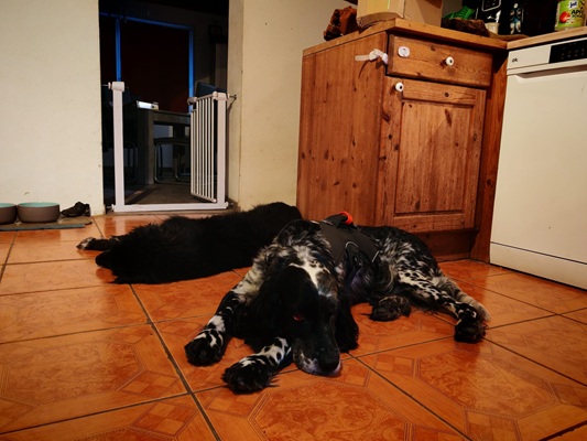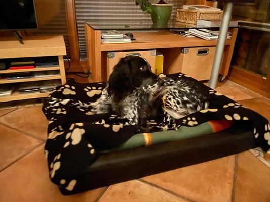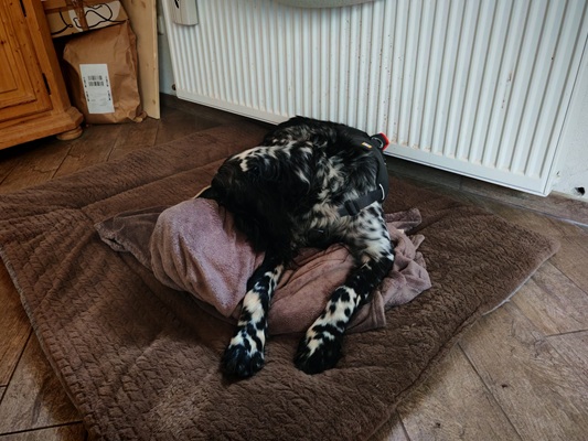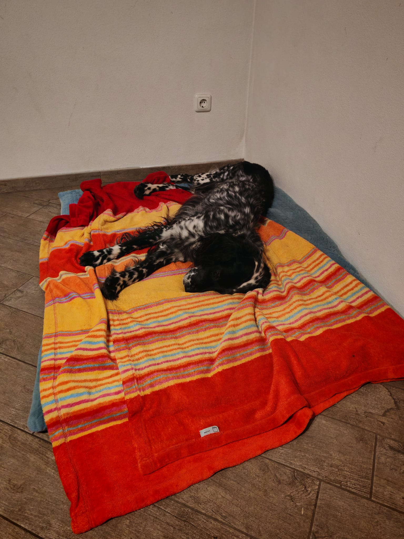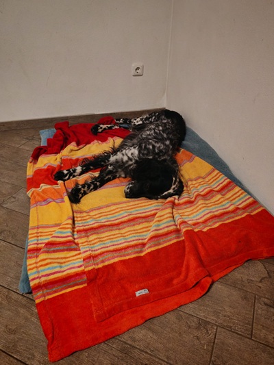 So ist er super im Rudel, er muss seinen Platz noch finden. Alleine bleiben klappt für eine kurze Zeit schon ganz gut. Hab die Kamera immer an und da liegt er auf dem Hundebett und schläft.