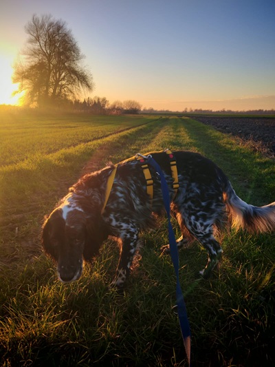 Beim Spazieren muss ich mich natürlich noch an diese Leine gewöhnen. Am liebsten würde ich über das ganze Feld laufen aber das geht leider noch nicht, sagt mein Pflegefrauchen. Da fehlt mich noch das Training. Was auch immer das wieder sein mag?