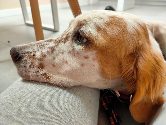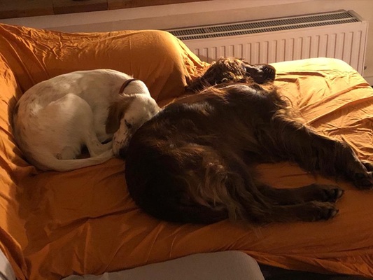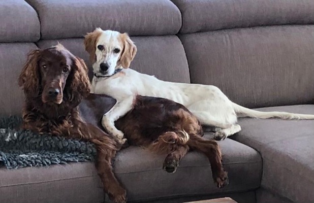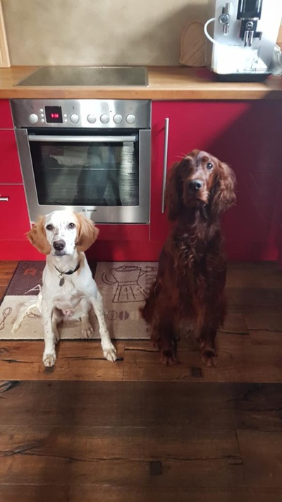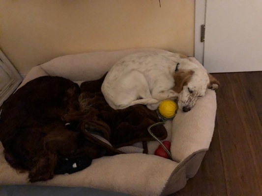Die kleine Kuschelmaus hat schon am ersten Tag ihre Lieblingsplätze in der Küche und auf dem Sofa gefunden und immer häufiger darf sie auch ganz dicht bei ihrer großen Irish Setter Schwester Macy liegen.