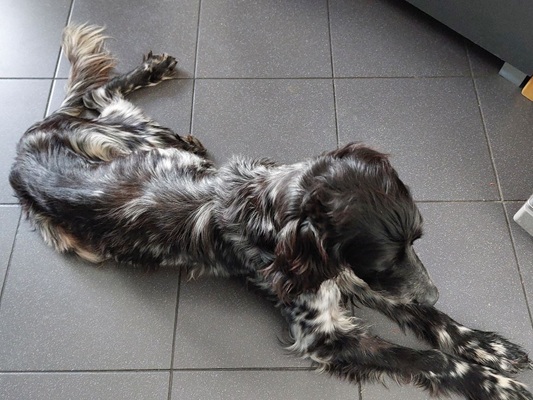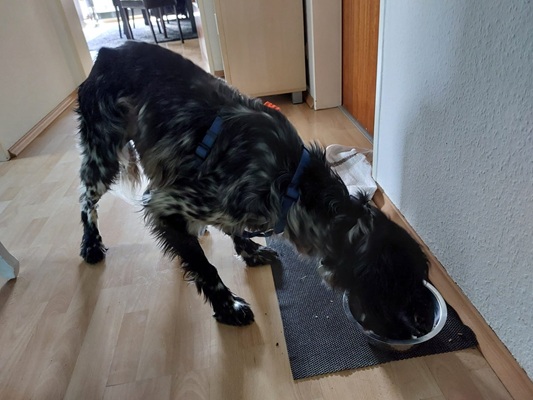 Frauchen hält sich streng an meine Essenswünsche und vor allem an die Zeiten. Man sagt, dass ich Diabetes habe, nur weil dieses blöde Piksding angeblich hohe Zuckerwerte anzeigen würde. Somit werde ich zweimal täglich noch mal mit einer Spritze im Nacken gequält. Aber ich bin ein Setter und stark. Außerdem sind alle inklusive der netten Tierärztin bemüht, rauszufinden was eigentlich los ist. Denn Durst und Hunger habe ich auf jeden Fall auch immer.