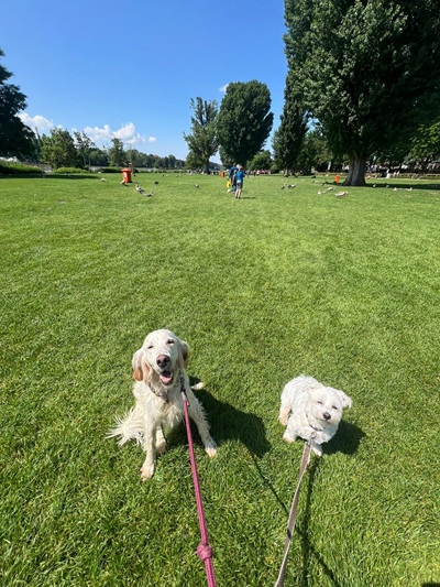 Bei Spaziergängen ist sie (noch) sehr aufgeregt und von allen Einflüssen ihrer Umwelt begeistert. Sie weiß gar nicht, wo sie zuerst schnuppern soll. Außerdem ist sie sehr mutig und robust. Die Nase wird einfach überall hineingesteckt. Wenn es irgendwo knallt, blinzelt sie nicht einmal und zeigt keinerlei Ängste.