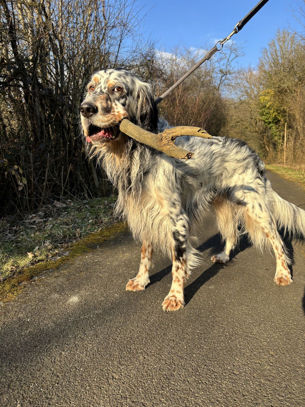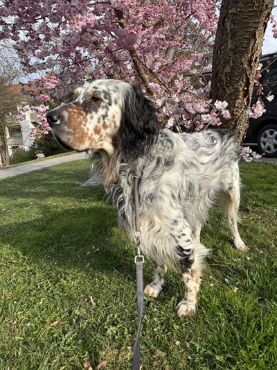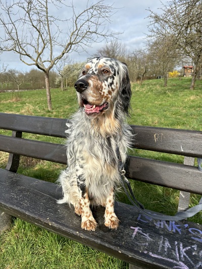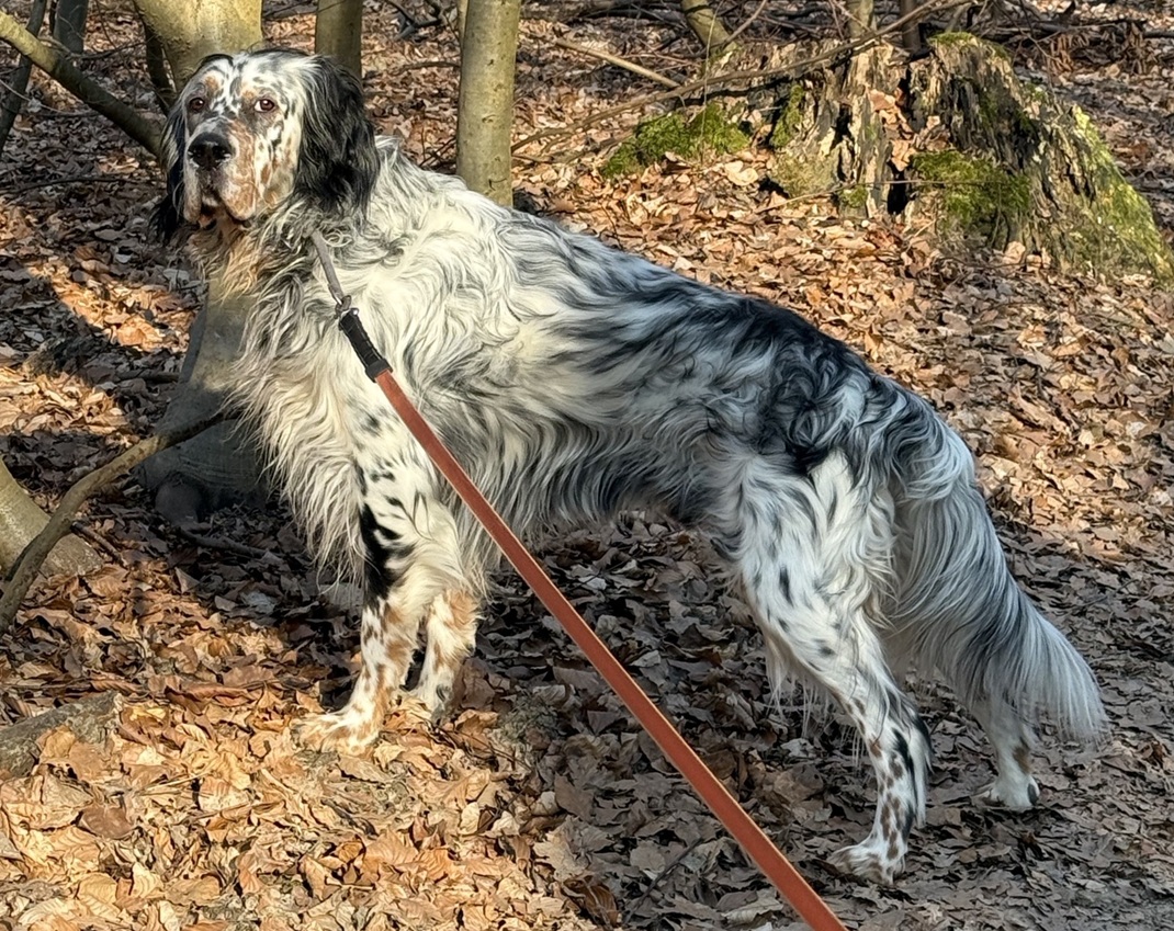 Mellow ist ein großer, fröhlicher und sanfter, kräftig gebauter, 4 Jahre alter tricolor English Setter.
