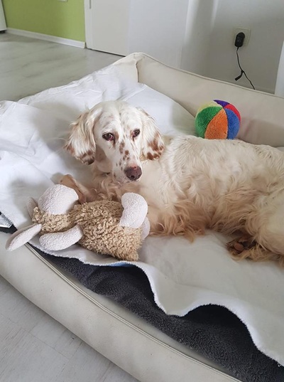 Auto fahren tut sie sehr gerne und mit ihren neuen drei setterfreunden spielt sie gerne und ohne Angst. Sie macht jeden Tag Fortschritte und traut sich immer mehr. Heute morgen haben wir mit dem Ball gespielt das hat ihr Spaß gemacht.