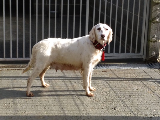 Die 4-jährige Orange Belton Hündin ist zusammen mit ihrer Mutter LINDA in der Perrera gelandet. Wie das Gesäuge vermuten lässt, hat die bildhübsche Setterine vor kurzem Junge bekommen.