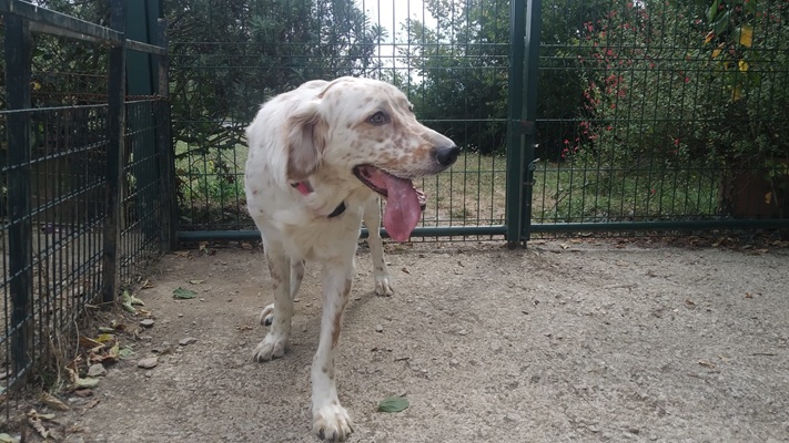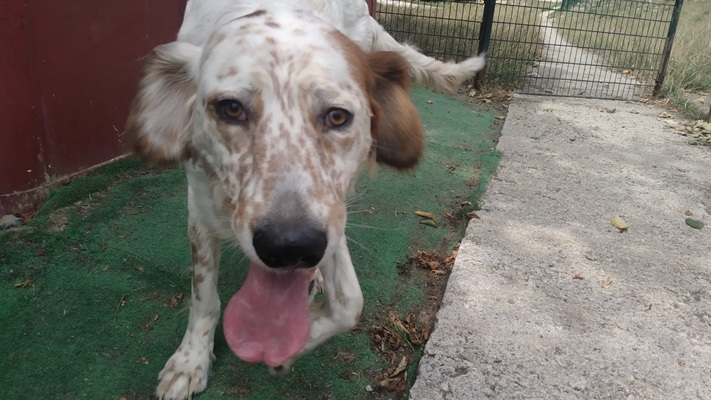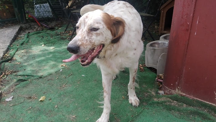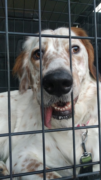 Ungewohnt eng und unwirtlich ist es hier für die gerade mal 1,5 Jahre alte hübsche und eigentlich fröhliche Orange Belton Hündin QUIRA mit den typisch orangefarbenen Ohren und Sommersprossen auf der Nase. Sie ist etwas anderes gewöhnt und weiß gar nicht, wie ihr geschieht…