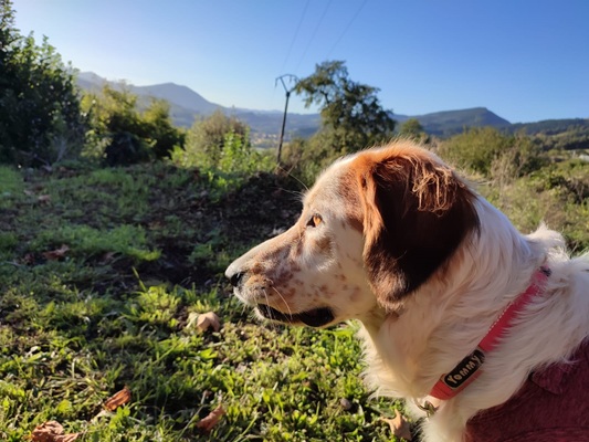 Auf unseren Gassigängen draußen schnüffelt sie gerne und ausgiebig, zeigt aber keinen ausgeprägten Jagdtrieb. Mäuselöcher sind immer interessant, auch mal ein Eichhörnchen oder eine Amsel. Auf der eingezäunten Hundewiese gibt sie richtig Gas, wenn mit ihr gespielt wird. Da hat sie richtig Spaß! Suchspiele draußen mit Leckerlis findet sie auch ganz toll.