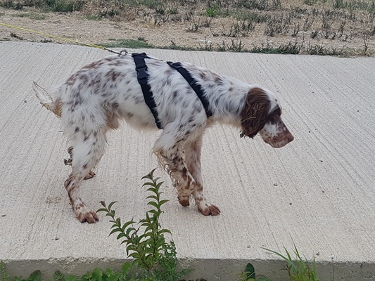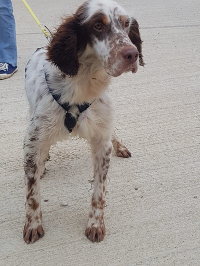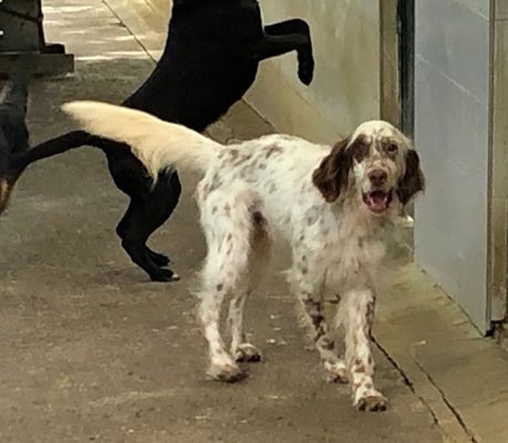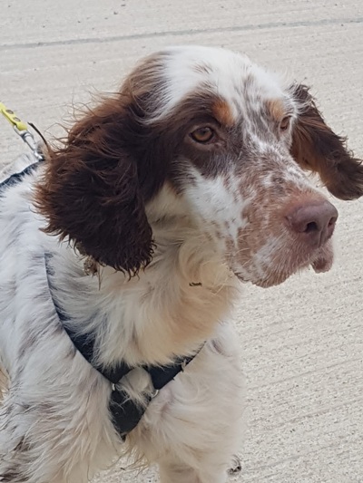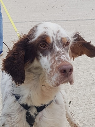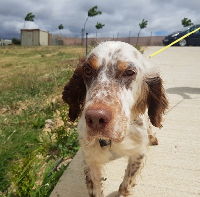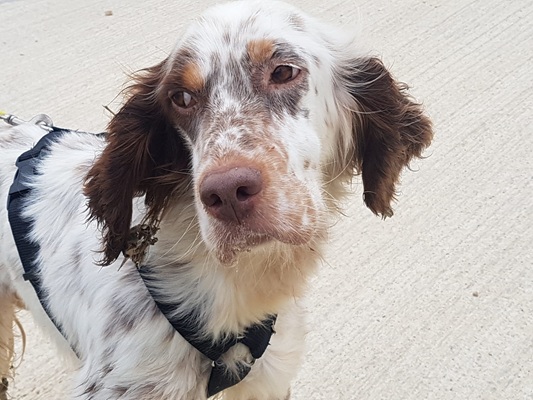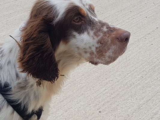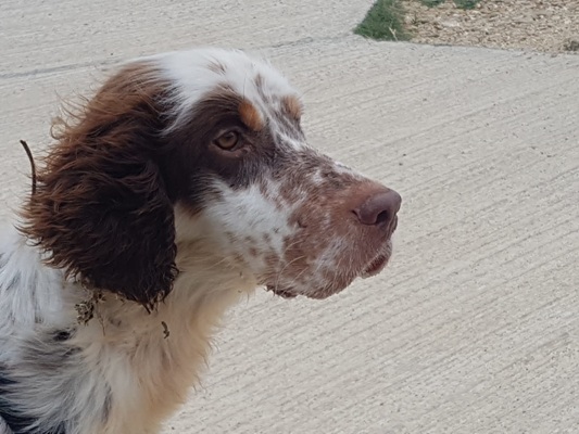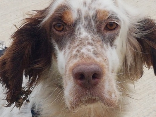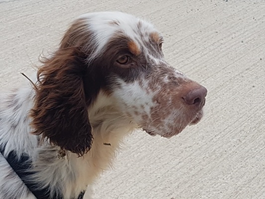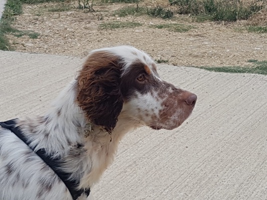 Erwartungsvoll schaut der schlanke Liver Belton Rüde von sechs Jahren sein Gegenüber an. Mit der hübschen Zeichnung seines Fells - einem braun umrandeten Auge - sieht er aus wie ein kleiner Pirat. Genauso blitzt ihm auch der Schalk aus seinen Augen und er lässt keine Gelegenheit aus, seinem fröhlichen Wesen freien Lauf zu lassen.