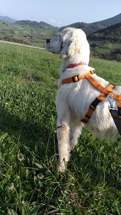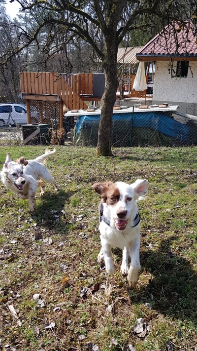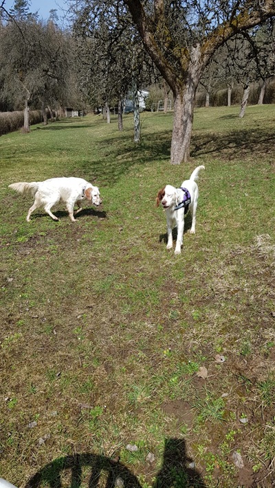 SHENA kam gesund und munter am 27. März 2021 im Setterland an. Sieist ein sehr kluger, anhänglicher und gelehriger lieber Hund ... Katzen werden inzwischen in Ruhe gelassen, mein Yorky wird halt überrannt, da muss ich etwas aufpassen. Sie hat schon gelernt das Futter der Katzen und meiner Hermine in Ruhe zu lassen, sie läuft frei ausserhalb des Grundstückes, sucht immer den Sichtkontakt und kommt auch wenn sie eine Spur hat auf Abruf angelaufen. Sie weiss wo sie wohnt, wenn sie vorausrennt und ich sie nicht rufe dann wartet sie vor der Gartentür. Autoverkehr gibt es bei uns nicht, sie hat Geschirr mit Name und meiner Telefonnummer. In dieser Hinsicht ist sie wirklich ein Traumhund.