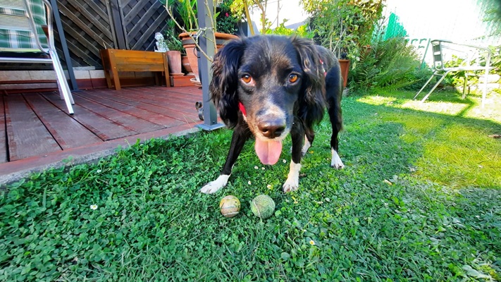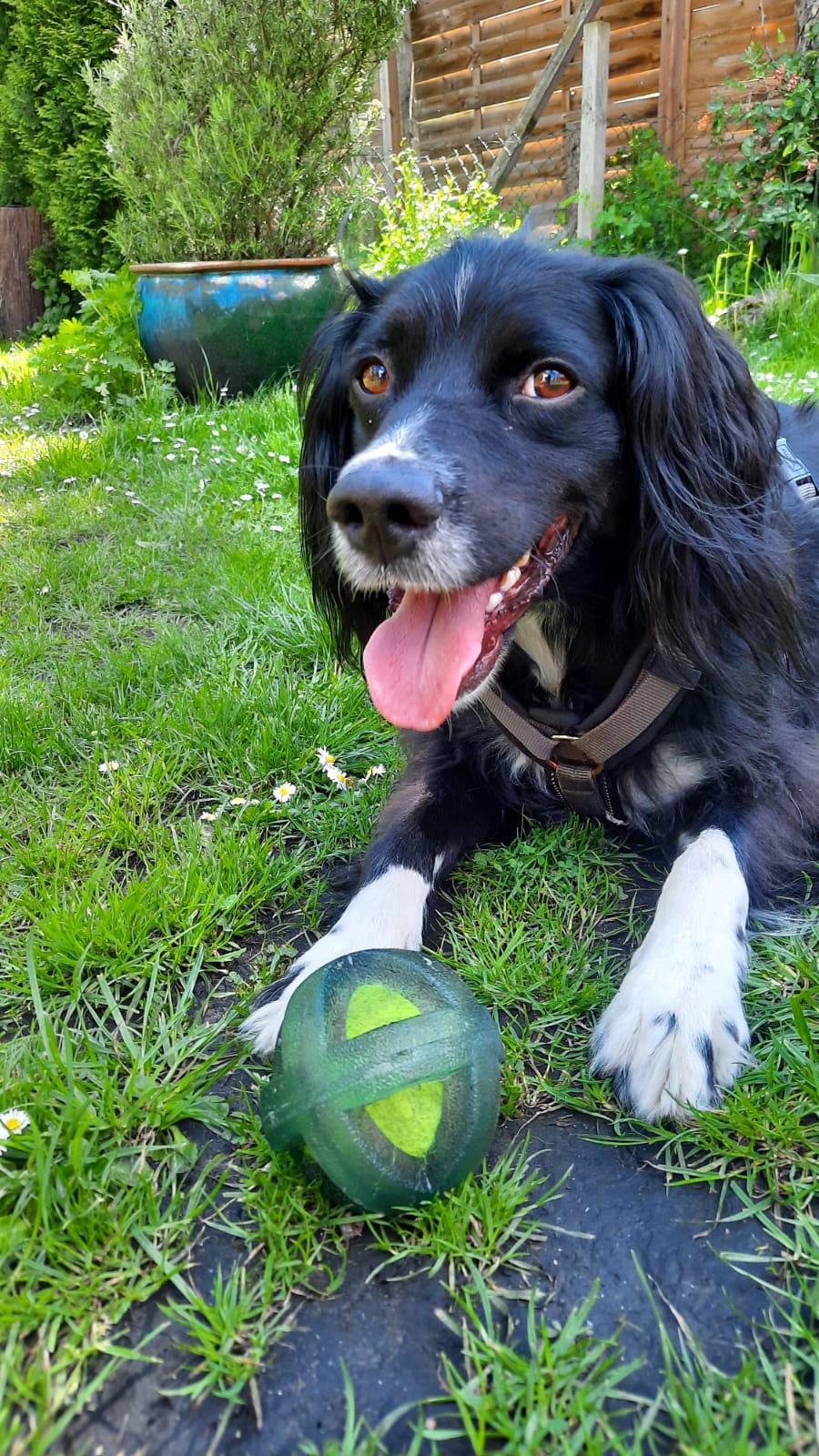 Die Grundkommandos Sitz, Platz, Hier oder Komm, klappen schon ganz gut. Es wird gerade an „bleib“ und „gib“den Ball geübt.