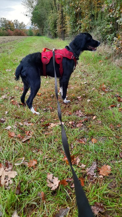 An der Leine geht er gut. Da er mittlerweile mehr Selbstbewusstsein gewonnen hat, wird manchmal etwas gezogen, vor allem wenn die Nase eine Fährte erschnüffelt.