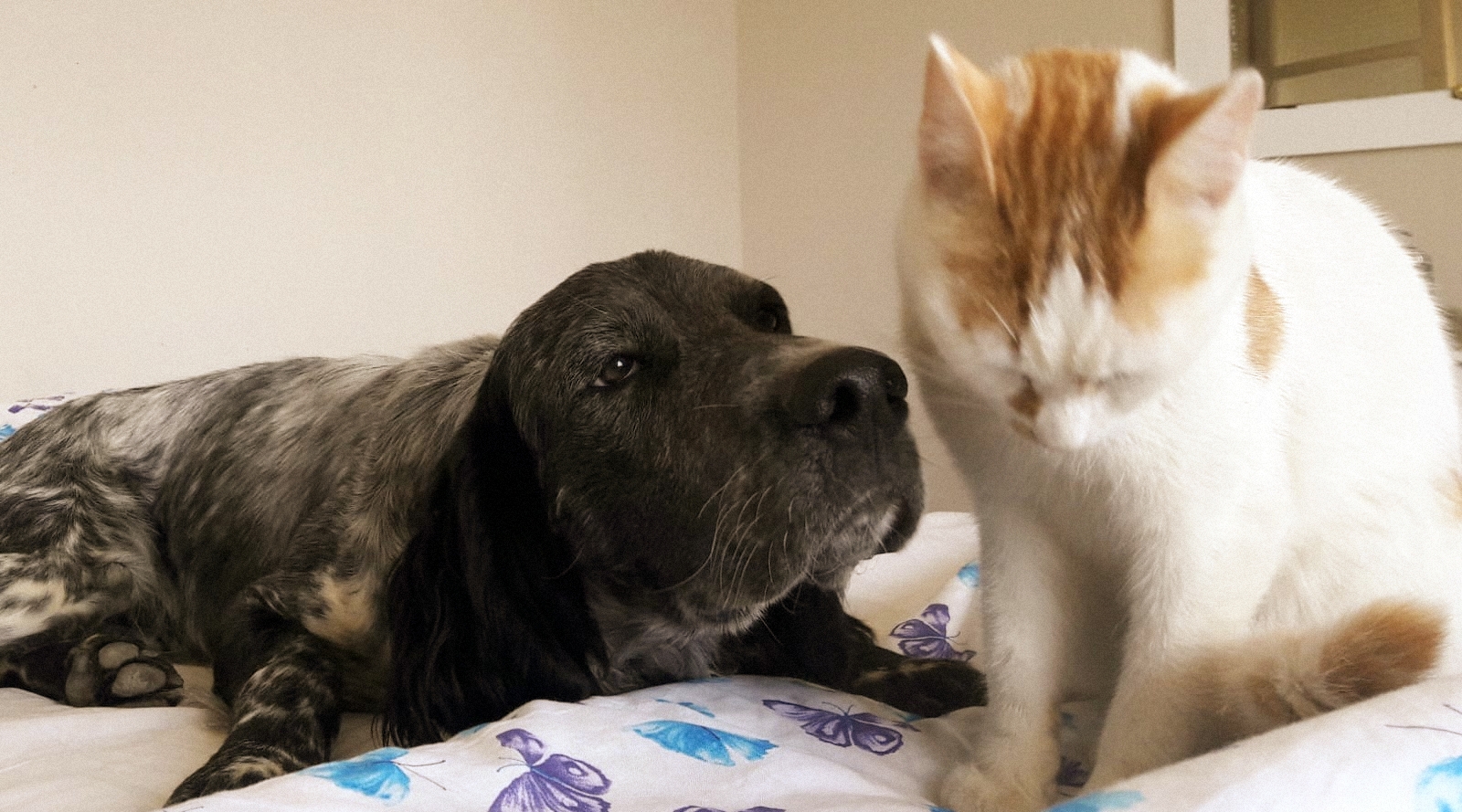 Das Bett seiner Herrschaften ist noch sehr attraktiv, abends legt er sich gern daneben auf seiner Decke ab, am Morgen würde er aber sehr gern eine Weile mit im Bett verweilen und macht das auch durch Jaulen entsprechend kund.