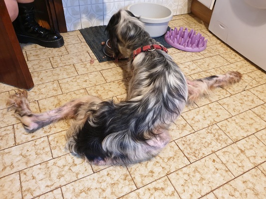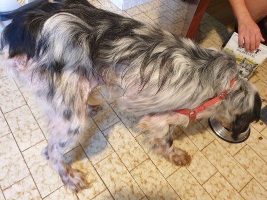 Dass TRASGU aber immer positiv denkt und wieder leben möchte, hat er schon in den ersten Tagen auf seiner Pflegestelle gezeigt. Denn – er kann es kaum glauben – er erhält täglich mehrmals leckerstes Futter und die Menschen dort pflegen seine Blessuren. Manchmal traut er sich nicht an den Napf, weil er kaum glauben kann, dass das Futter wirklich für ihn ist. Schon nach einer Woche hat sich die Haut sichtlich erholt und seine Augen- und Ohrenentzündung werden langsam besser. Die Pflegefamilie ist sich sicher, dass TRASGU – wenn er erst einmal wieder fit ist – ein wundervoller Tricolorrüde wird, der seiner zukünftigen Familie viel Freude bereiten wird.