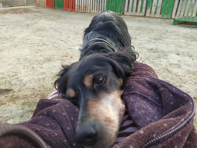 Neun Jahre hat der liebevolle Rüde nur arbeiten müssen und fristete ansonsten ein langweiliges Dasein im Zwinger. Treu ergeben hat er sich dennoch seinem Jäger angeschlossen und sein Schicksal mit Würde getragen. JESTER zeigt ihm Fotos von seinen Hundekumpeln, die schon im Setterland glücklich leben und über beide Ohren strahlen.