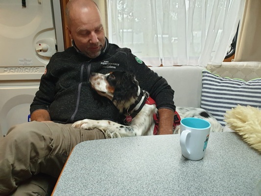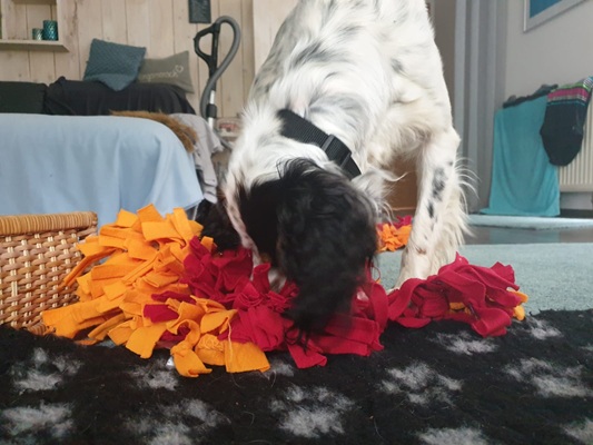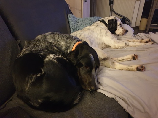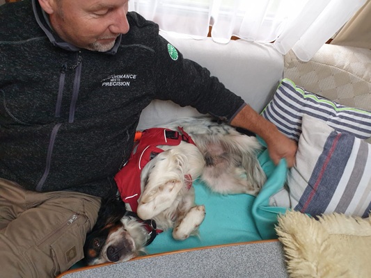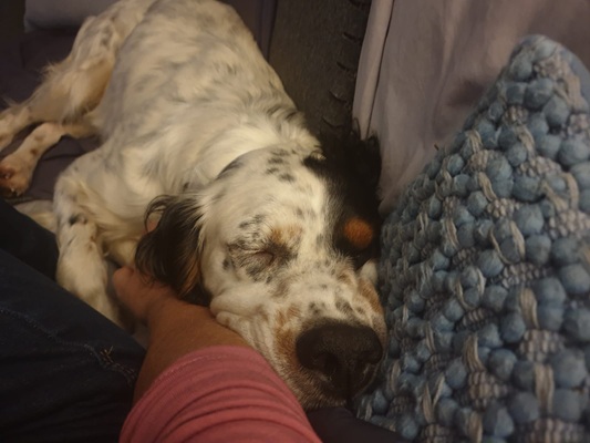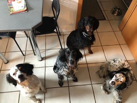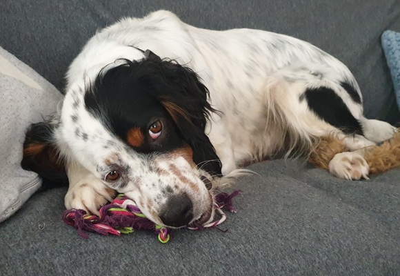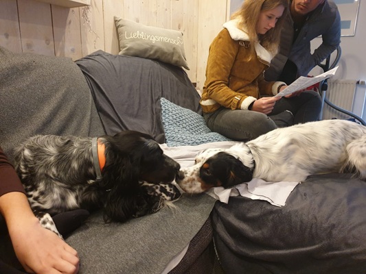 YVAIN hat sich schnell bei uns eingelebt. Er ist stubenrein und verhält sich im Haus ruhig und sehr neugierig. Er beobachtet uns sehr genau. Laute Geräusche findet er noch unheimlich und reagiert etwas ängstlich, aber nicht panisch. Mit unseren Beiden Settern bleibt er sogar schon eine kurze Zeit allein. YVAIN kuschelt gern mit Mensch oder Hund. Alterstypisch ist er sehr verspielt. Gern verschleppt er meine Schuhe, macht sie aber nicht kaputt.